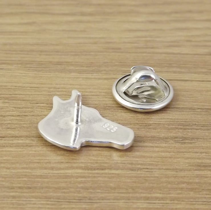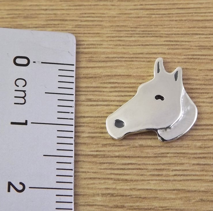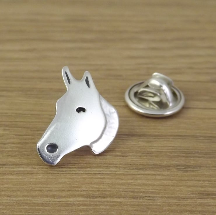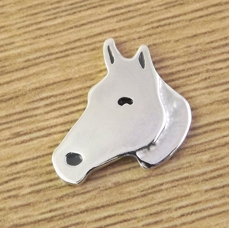 This horse badge/lapel pin/tie tack has been lovingly crafted by hand in Shropshire. It is made from sterling silver sheet and is etched before being cut by hand, I then smooth the edges using files and emery paper before it's carefully given its shape using a punch and hammer. a pin is then soldered onto the back. Black and grey resin based enamels are added to the etched areas and then the piece is polished.
