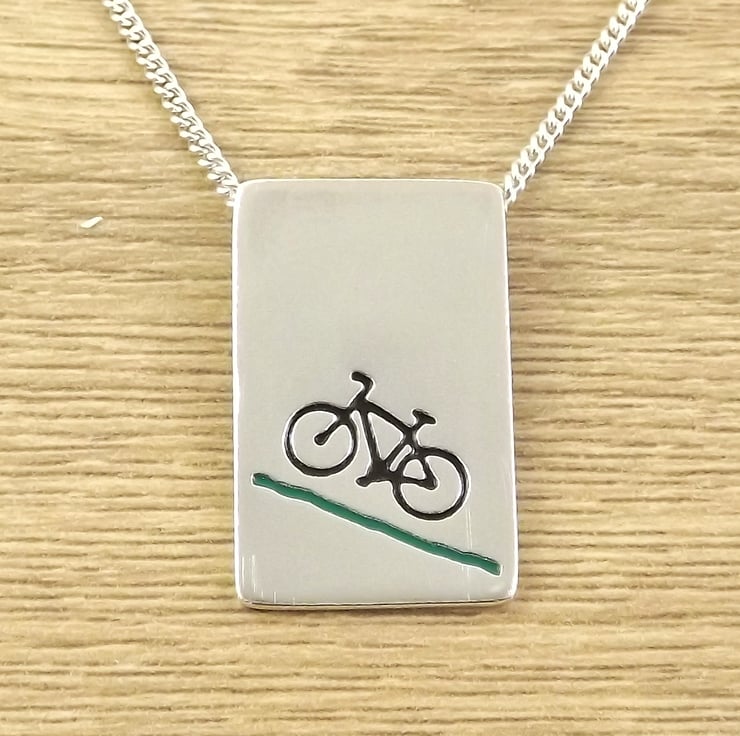 This large mountain bike pendant has been lovingly crafted by in Shropshire. It is handmade from sterling silver sheet and is etched before being cut by hand, the edges are then smoothed using files and emery paper. Two pieces of 1mm wire are attached to the rear to hold the chain. Black and green resin based enamels are added to the etched areas and the piece is then polished before being attached to a chain.