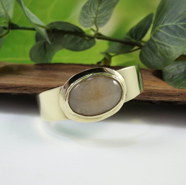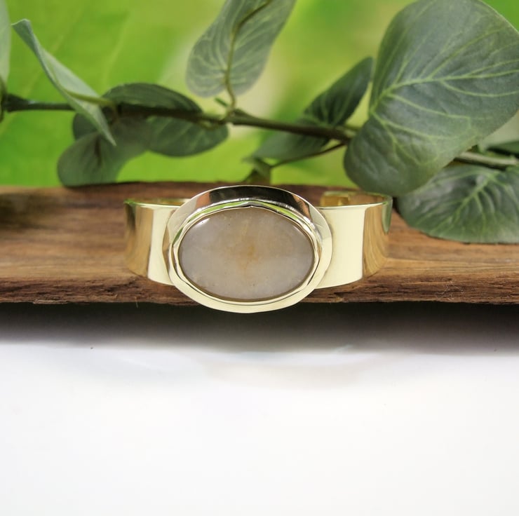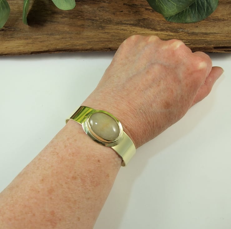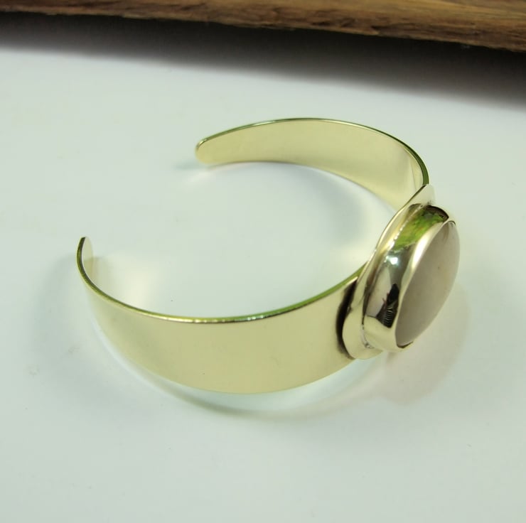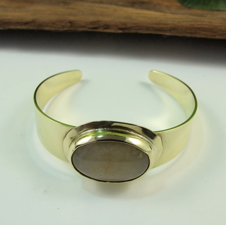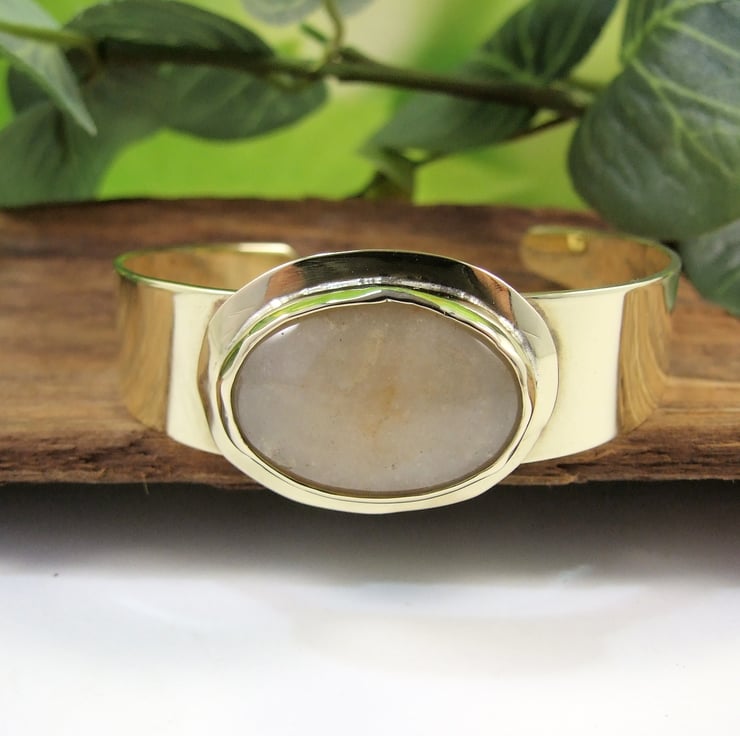 Brass Cuff Bangle set with large oval quartz gemstone. Sized to fit an average ladies medium size, can be adjusted to suit wearer.