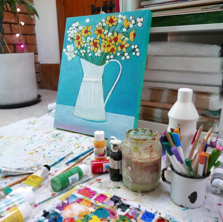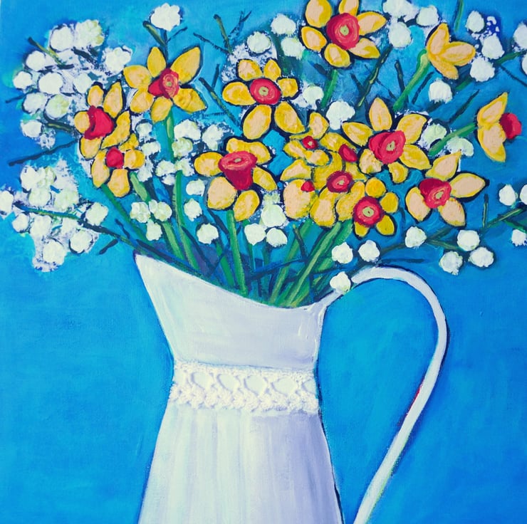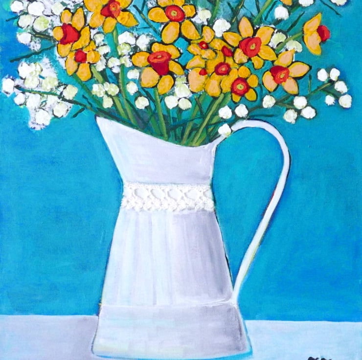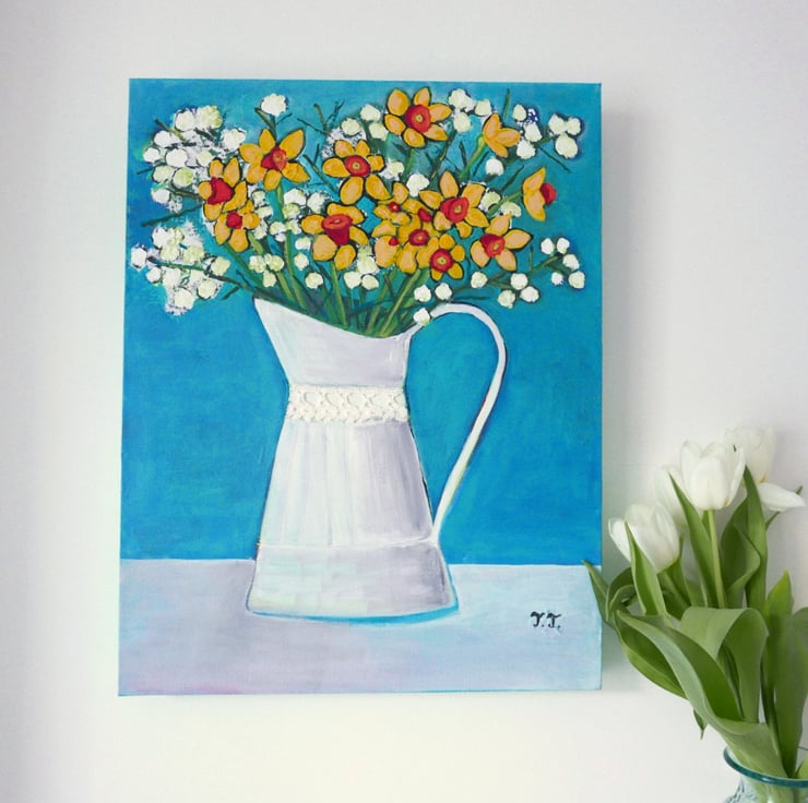 This is a still life painting created by me in acrylic on canvas, painted on the edges and ready to hang. It features a bouquet of daffodils and white flowers in a white vintage vase against an aqua blue background. The vase has a small lace detail that is glued onto the canvas with strong glue.