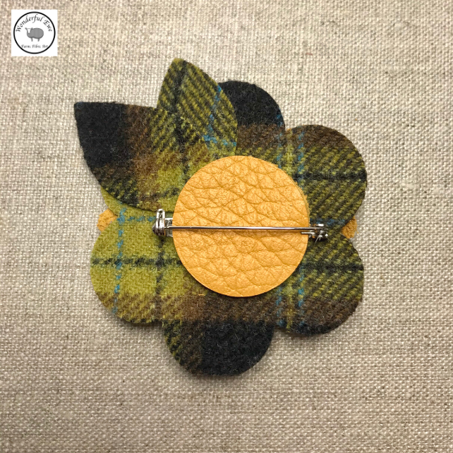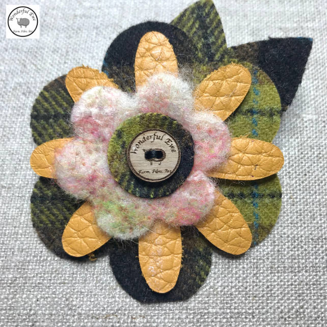 Flower and leaf shaped layers of leather tweed and felt are sewn together to create a tactile three dimensional flower finished with a cute little walnut button.