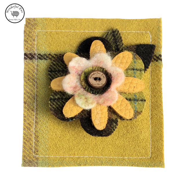 Flower brooch - Shades of Yellow Blue and brown, embellished with a tiny wooden button engraved with the Wonderful Ewe logo. Attached to a blank card so that it doubles as a gift and a card. It can easily be sent through the post.