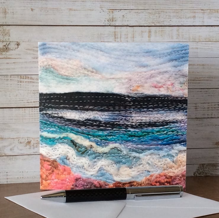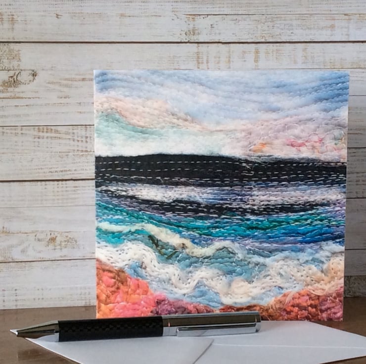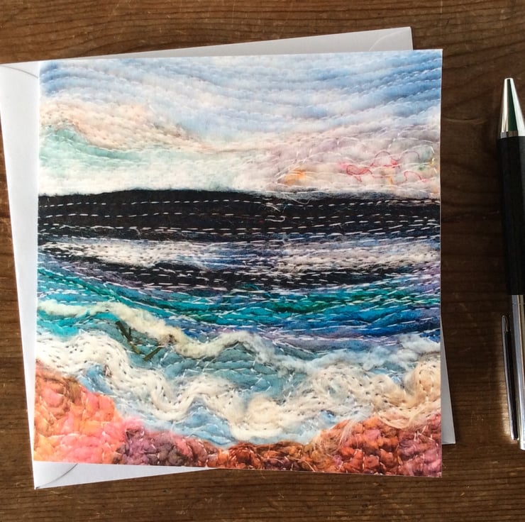 This card is a print of one of my free motion embroidered needle felted seascapes of Yorkshire. The tide is coming in and the waves are gently making their way up the beach on a beautiful summers day. It’s blank inside making ideal for any occasion. The card measures 14.5 x 14.5cm and it comes with an envelop in a plastic cover for protection.