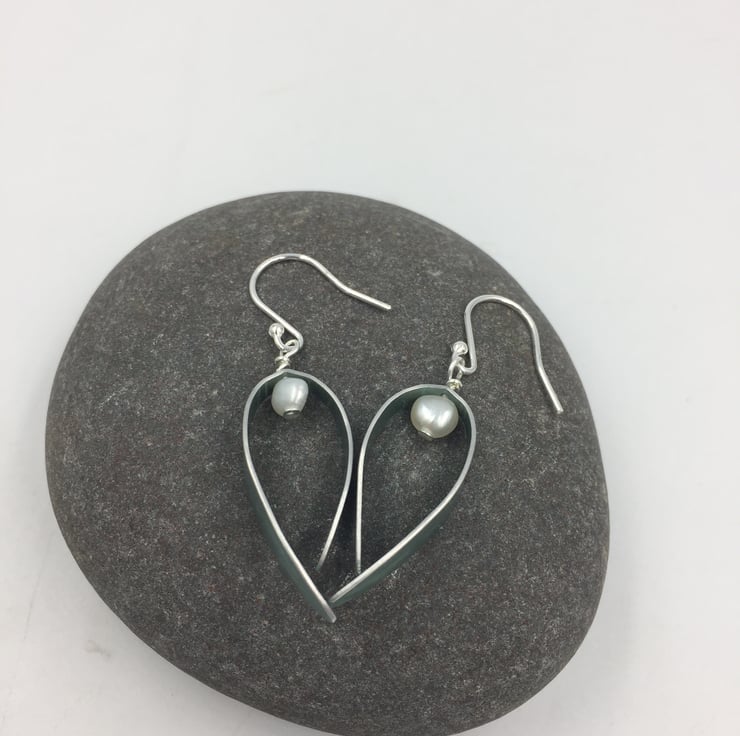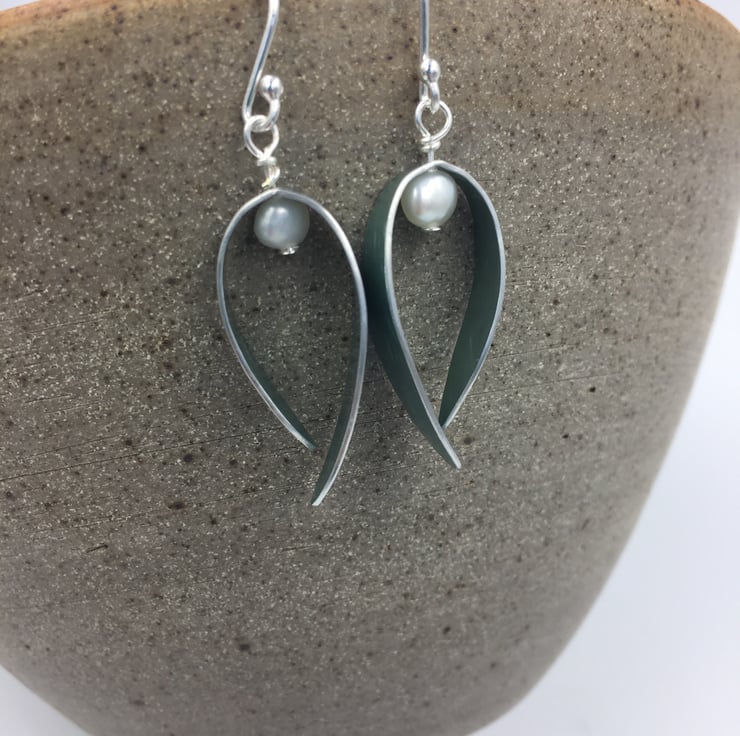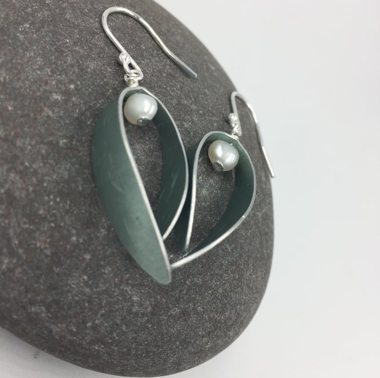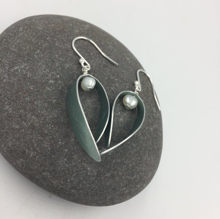 The curved leaf shape has been textured using a leaf skeleton and a rolling mill. The metal was dyed pale teal. A white freshwater pearl is suspended at the top and the earrings hang from sterling silver ear hooks.