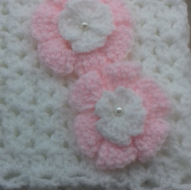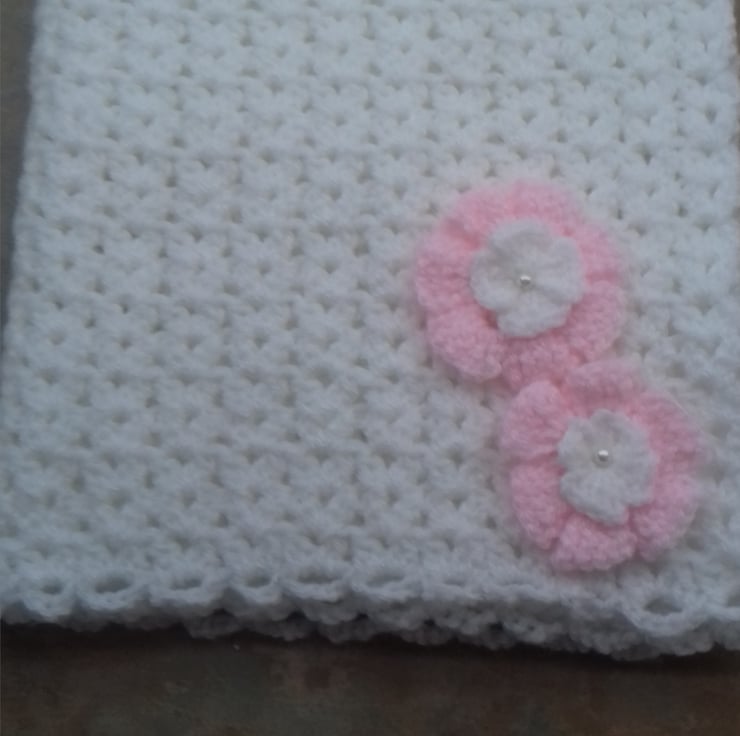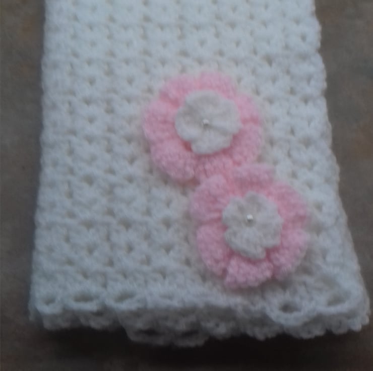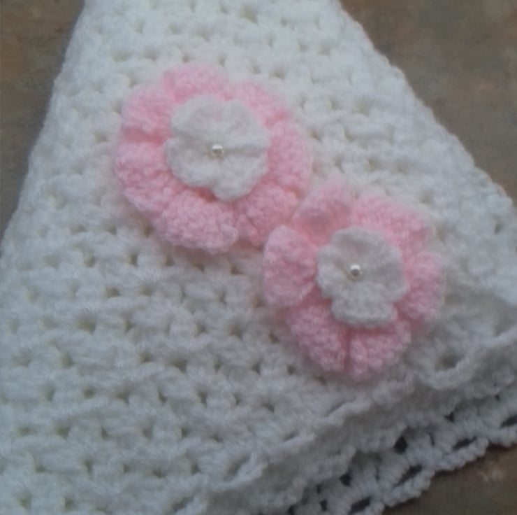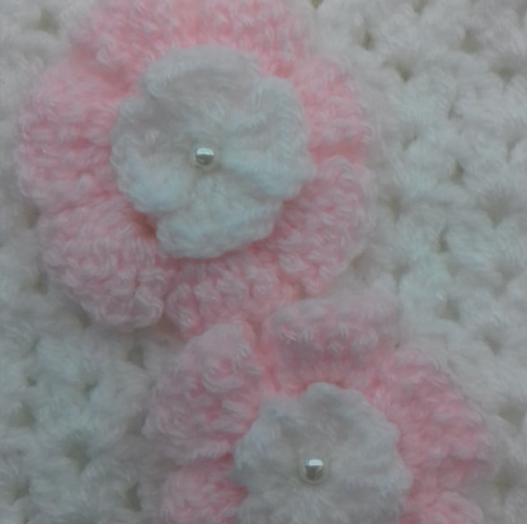 white crocheted baby girl blanket with pale pink and white crocheted flowers with small white pearl in middle of flower.