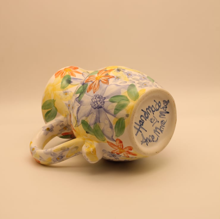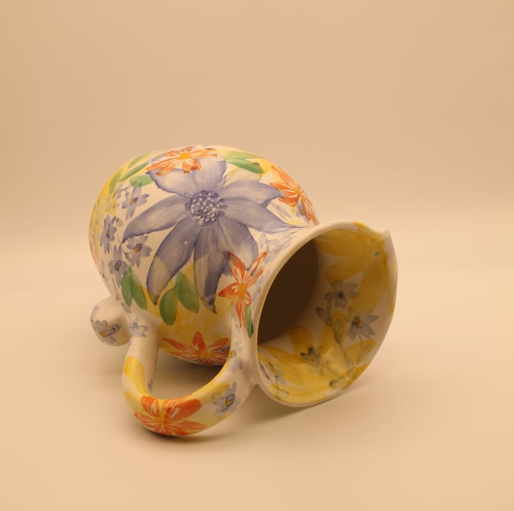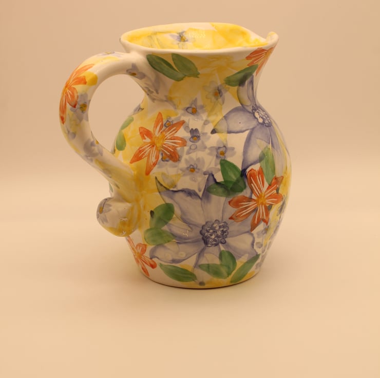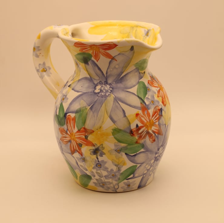 A jug which has been slip cast with white earthenware clay in a plaster mould made for me. Once bisque fired to 1050 C, the jug was dipped into a tin glaze and then the flowers were painted on top using Chinese brushes. Painting on top of an unfired glaze is the Majolica technique which is used a lot in Italy and Spain. The jug was fired again to 1020 C.