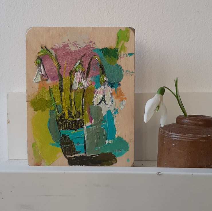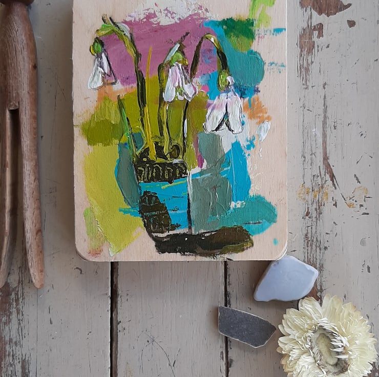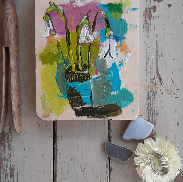 Small and sweet .three snowdrops representing three friends. Semi abstract, rich texture and brush work.painted by artist Hesta Singlewood on thick reclaimed wood ready to hang .measuring 11cm tall 8cm.across.