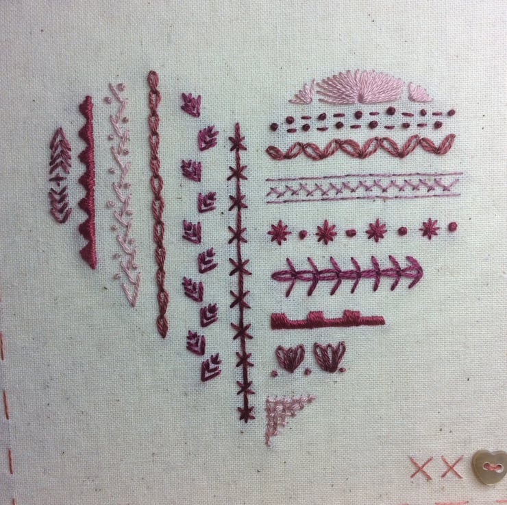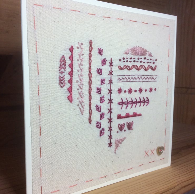 A beautifully intricate hand embroidered heart, stitched in shades of pinks and reds. A perfect card for an engagement, anniversary or wedding, it is a one off keepsake card that could be framed to make a lasting gift. It measures 12.5 x 12.5cm and is backed onto cream card with matching envelope. It is left blank inside for your own message.