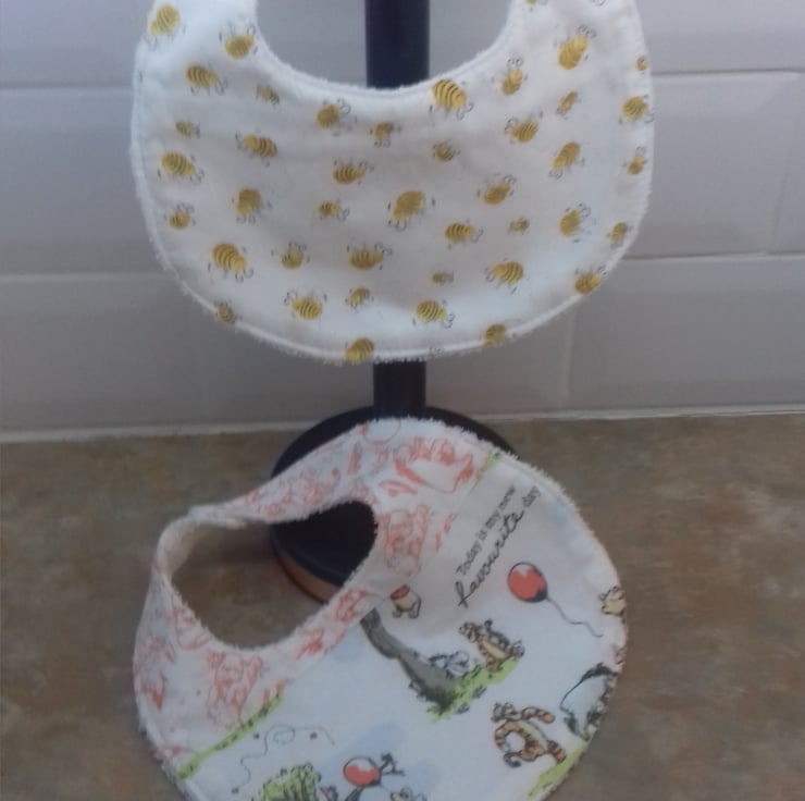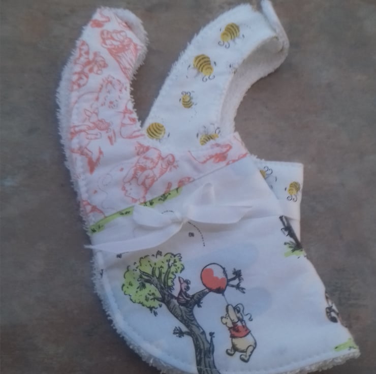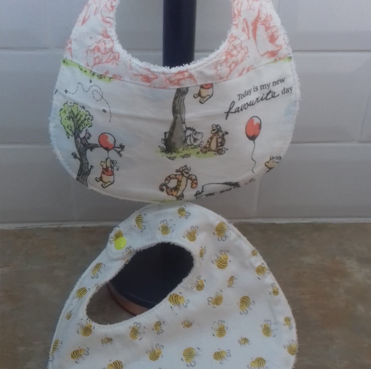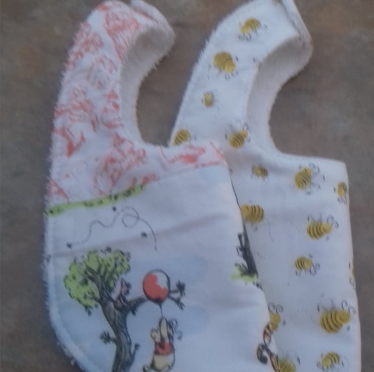 This set is for two bibs,both made from 100% cotton fabric .In Winnie the Pooh fabric.