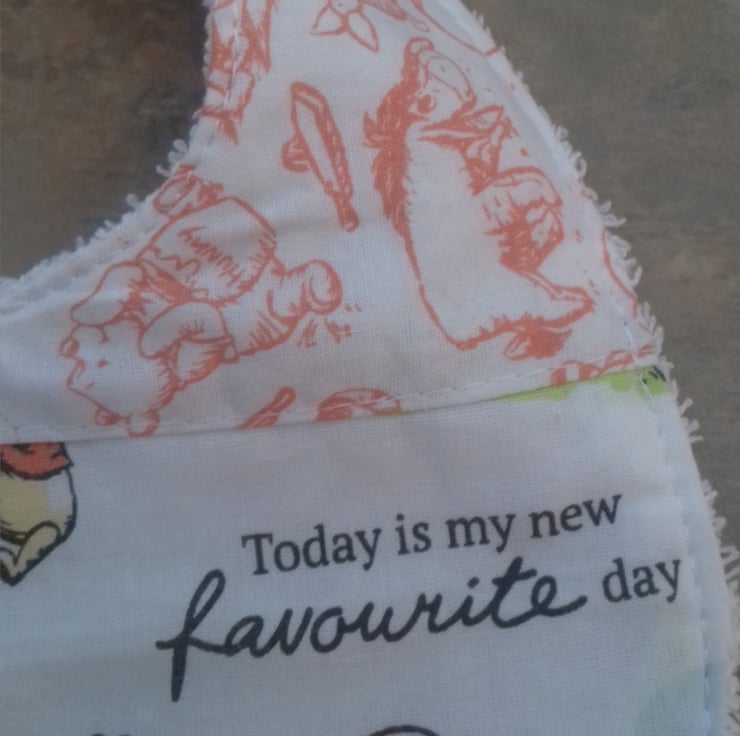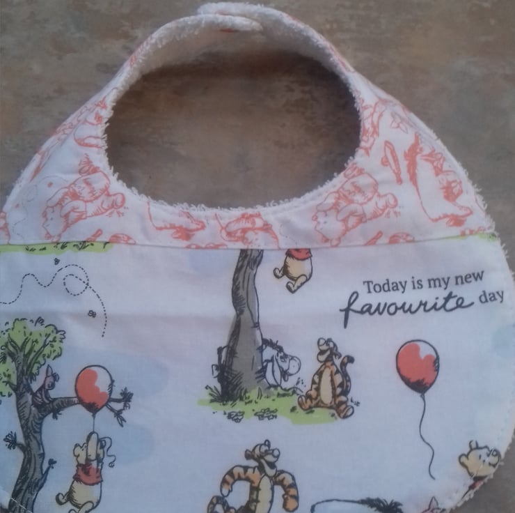 One bib has Winnie the Pooh and tigger on a white back ground the top of the bib is Winnie Pooh and tigger in orange on a white back ground .It has a orange popper snap fastenings.