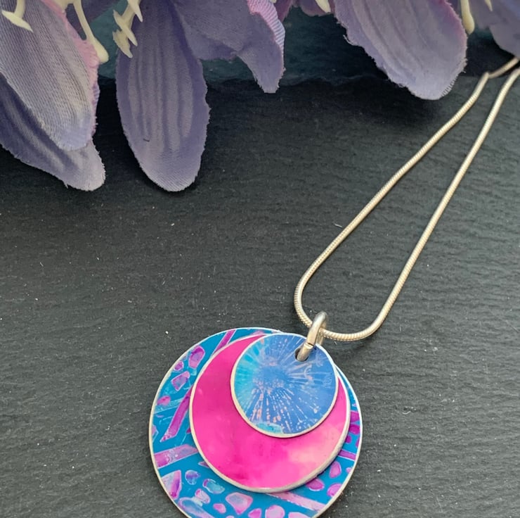 The pendant is made with 3 layered discs. Each layer has been hand painted. The larger lower disc is dark turquoise with a cerise pink print. The middle layer is cerise pink and the top layer is turquoise with very subtle flecks of pale pink.