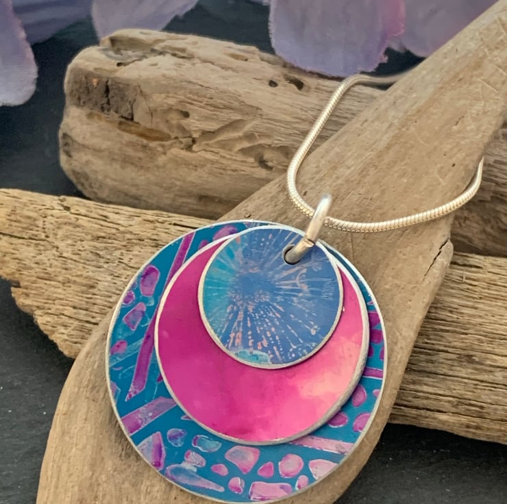 Hand painted and hand crafted Aluminium/sterling silver layered pendant.