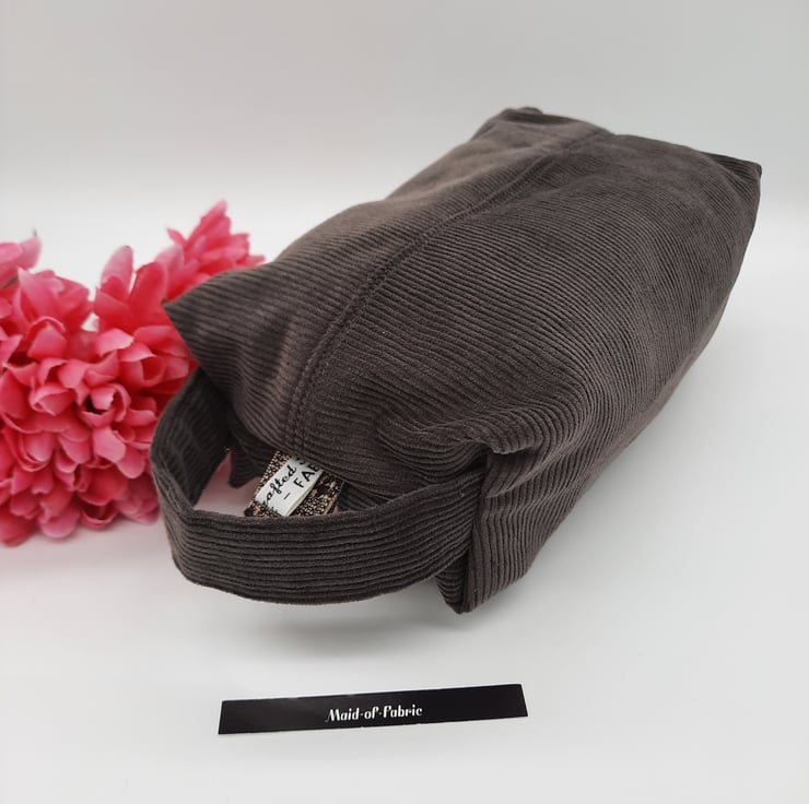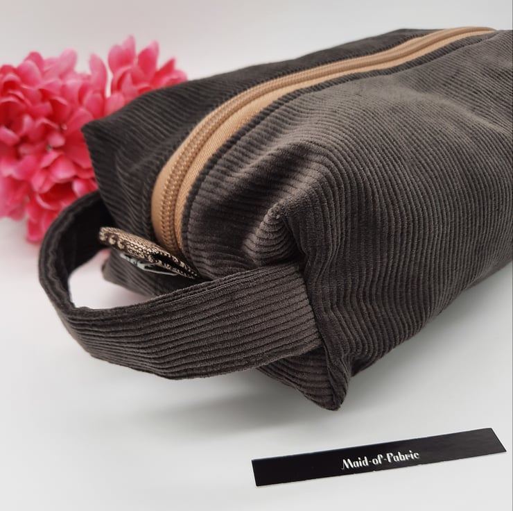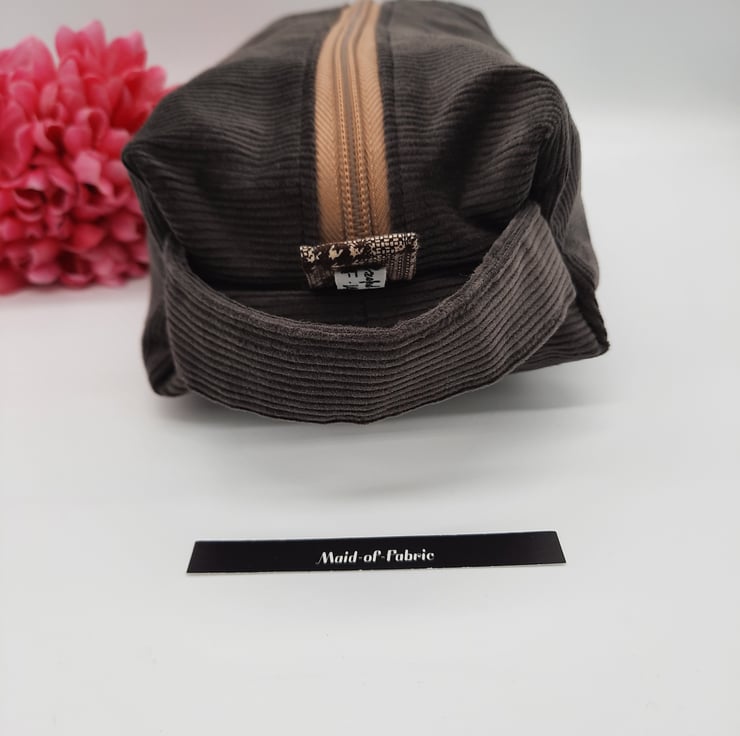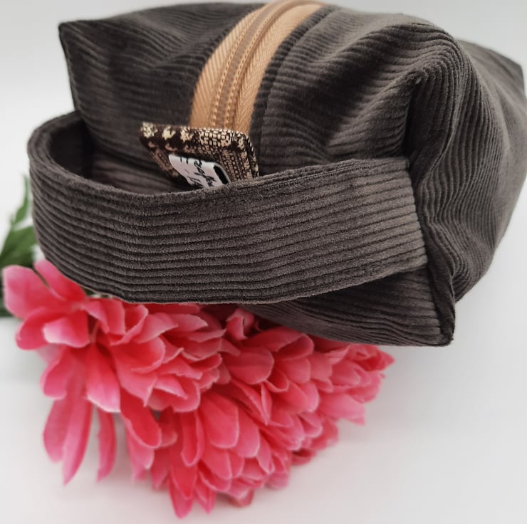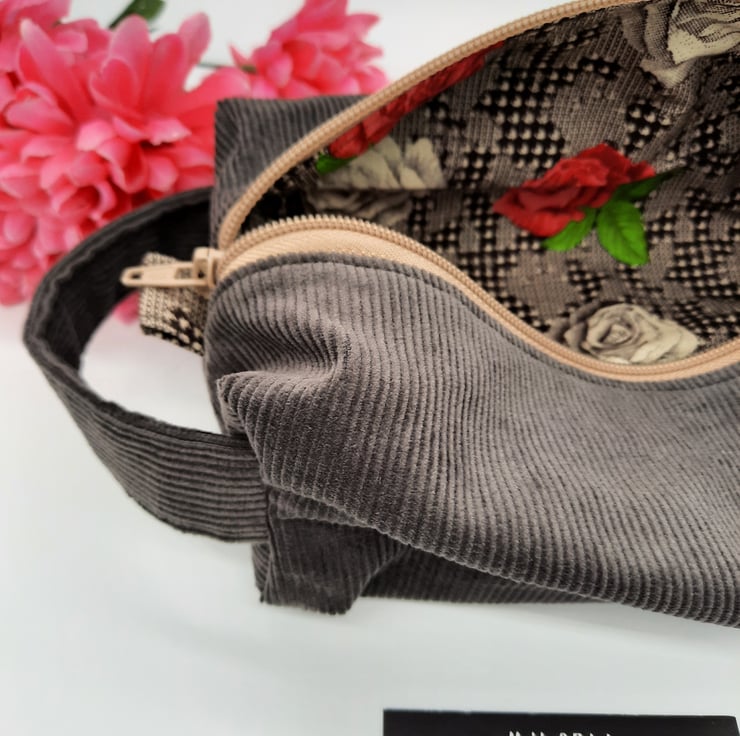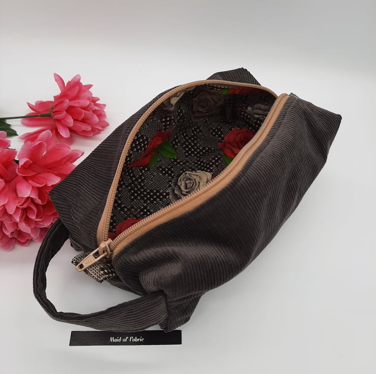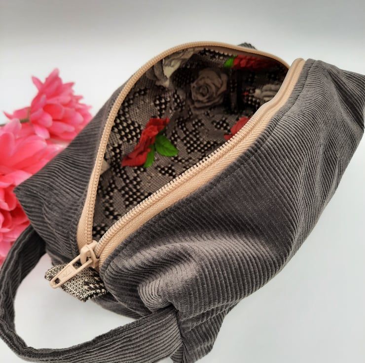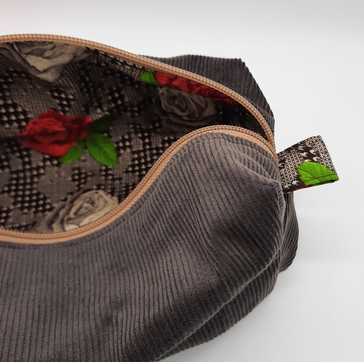 Boxed make up bag made using a charcoal grey corduroy, red and cream rose cotton lining and a beige zip.