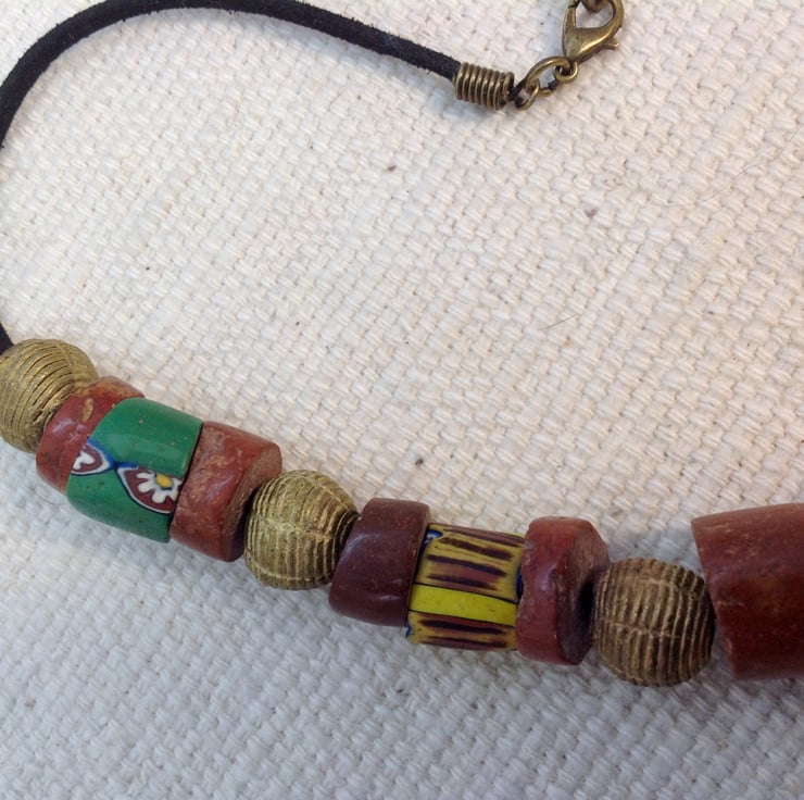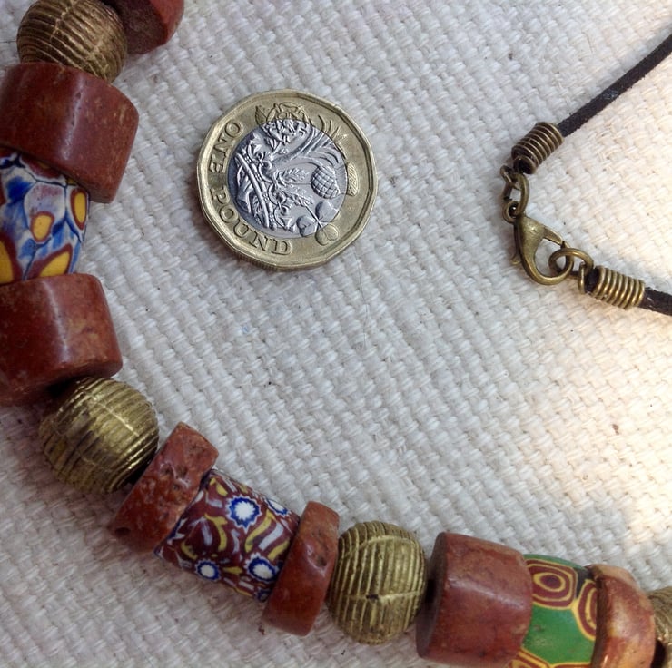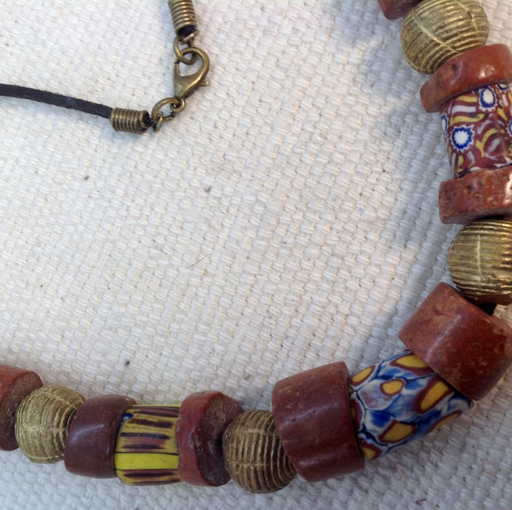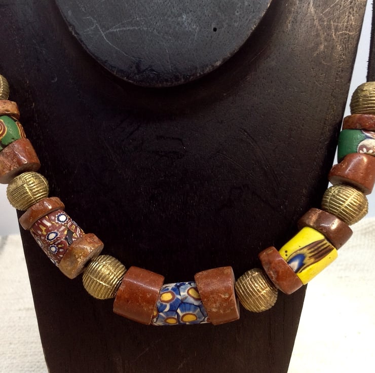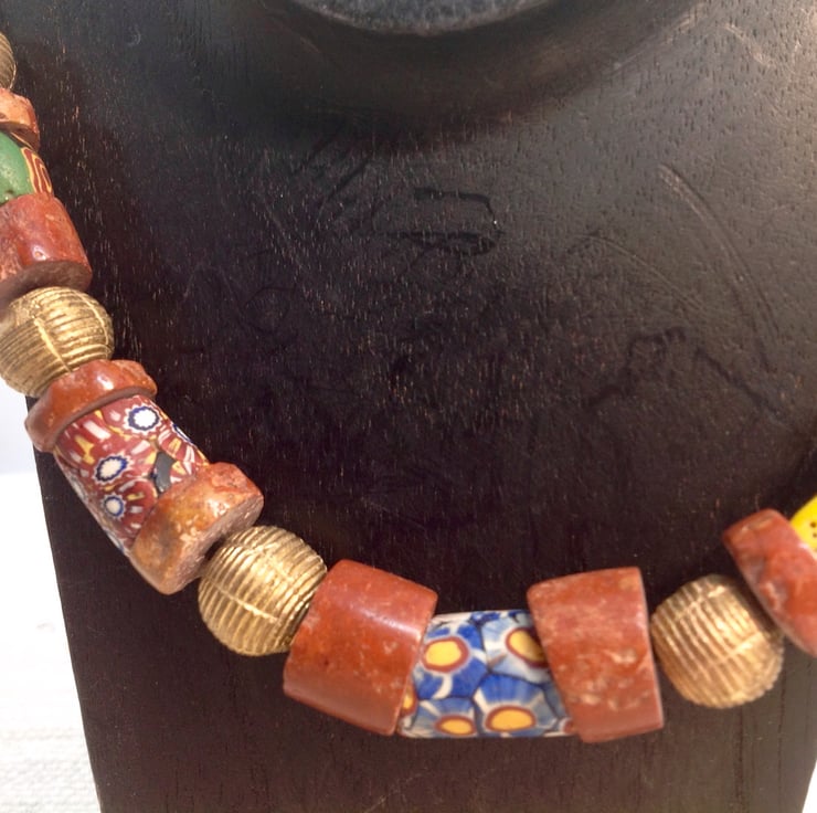 They have been strung with some bauxite discs originating in West Africa which do show some signs of wear reflecting their long history. Also some new handmade Ghanaian beads made from recycled brass using the 'lost wax' method which means each is made from a one-off mould and so is quite unique.