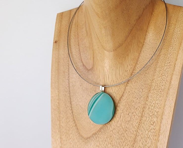 The aquamarine striped fused glass pendant has a tactile matt surface just like a sea smoothed pebble and comes complete with a chunky silver plated bail, a stainless steel choker and gift box, just ready to give as a gift.