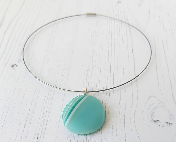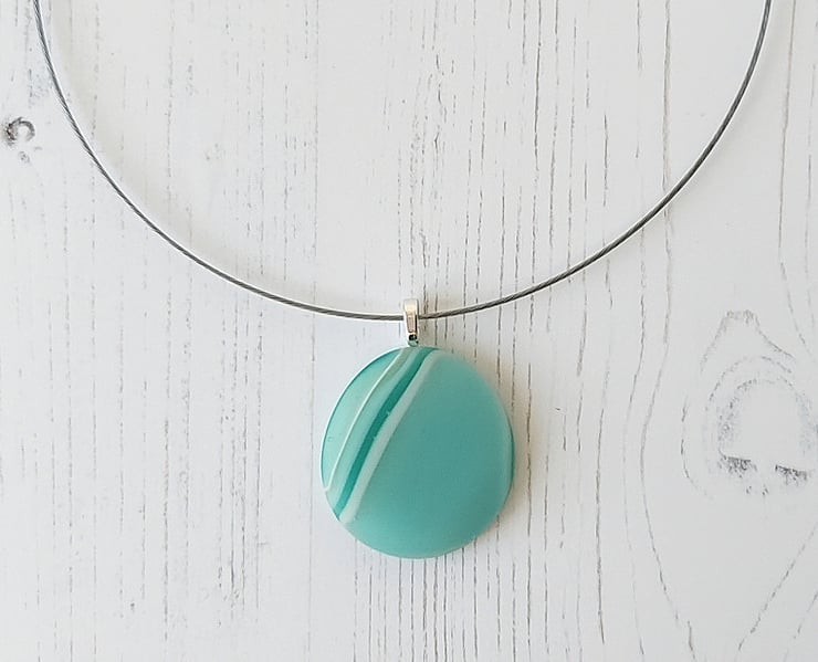 Round aqua striped fused glass pendant from my Seafoam series, handmade by me in my studio on the Wirral peninsula, NW England.