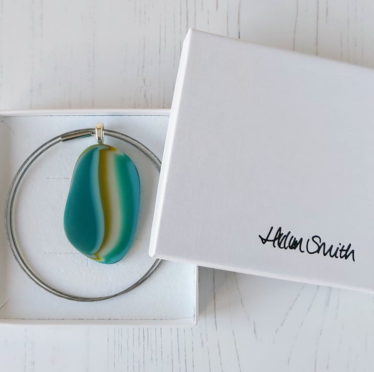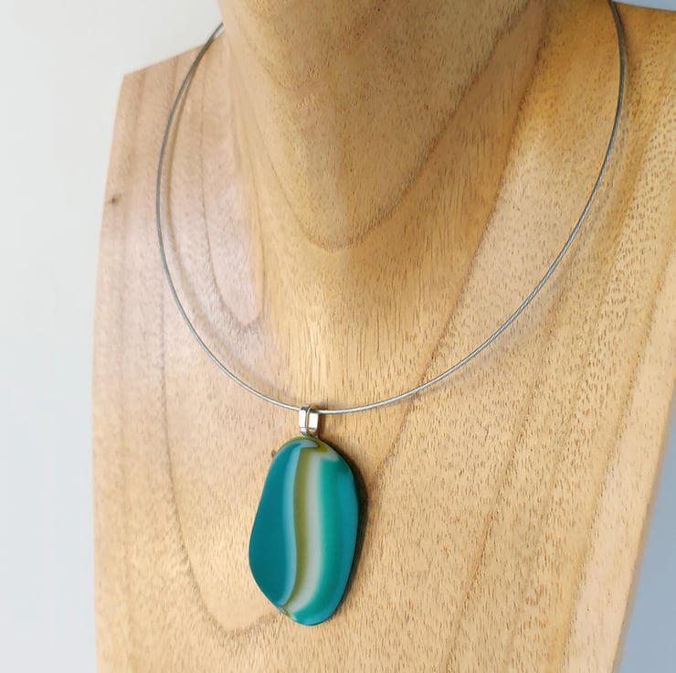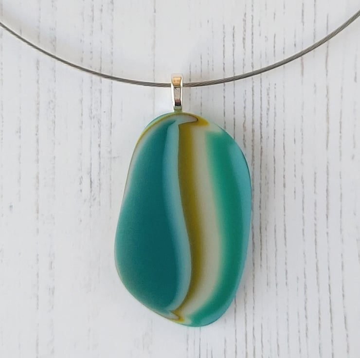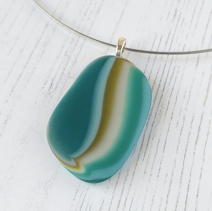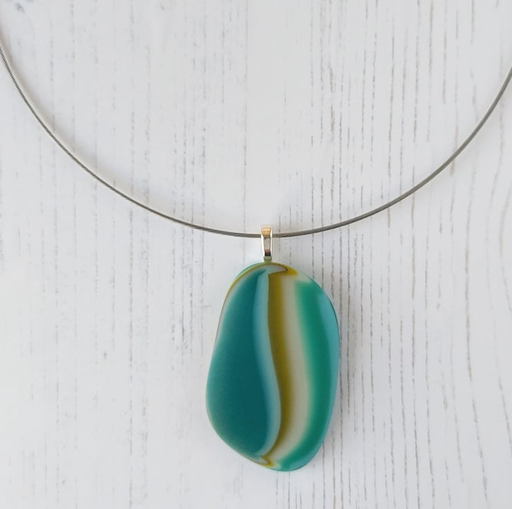 Teal striped fused glass pendant from my Strandlines series, handmade by me in my studio on the Wirral peninsula, NW England.