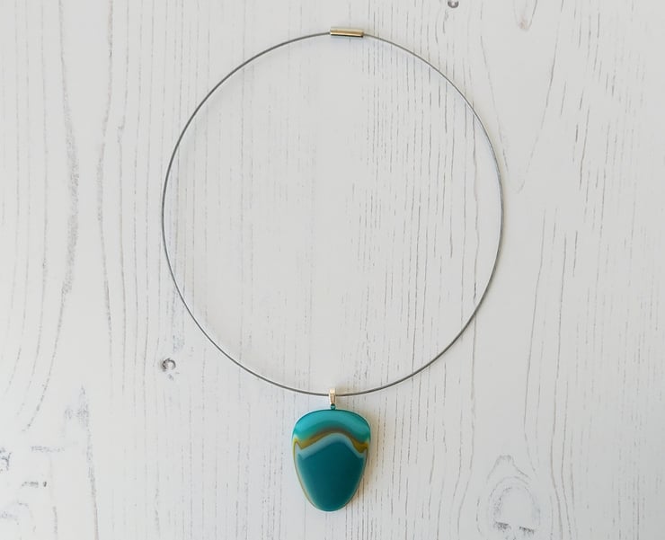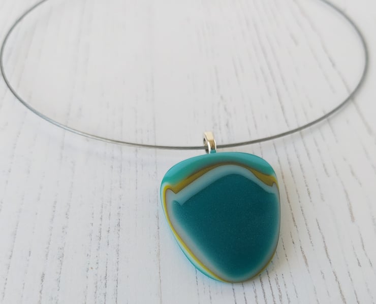 Teal fused glass pendant from my Strandlines series, handmade by me in my studio on the Wirral peninsula, NW England.