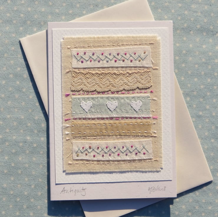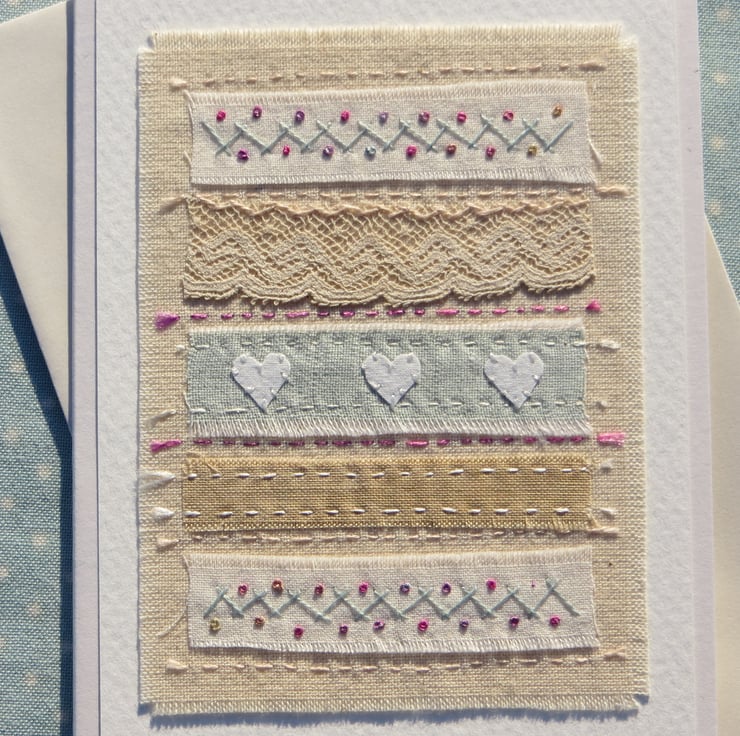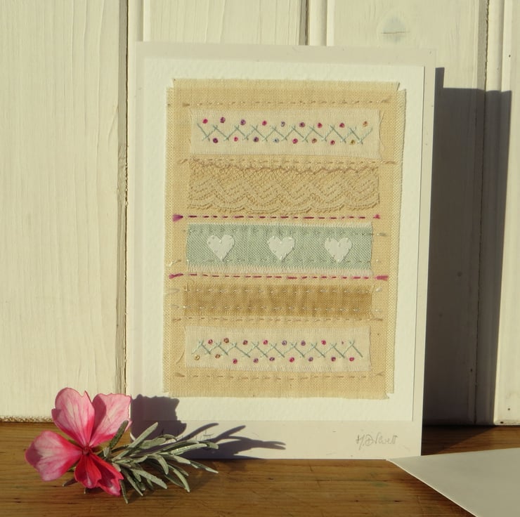 This is a hand-stitched textile miniature mounted onto greeting card - a gift in itself to keep and frame, as well as a card in which to write your message. I have embroidered a lattice with rosebuds, incorporating my hand-dyed recycled cottons and vintage cotton lace. There are also three tiny applique hearts.