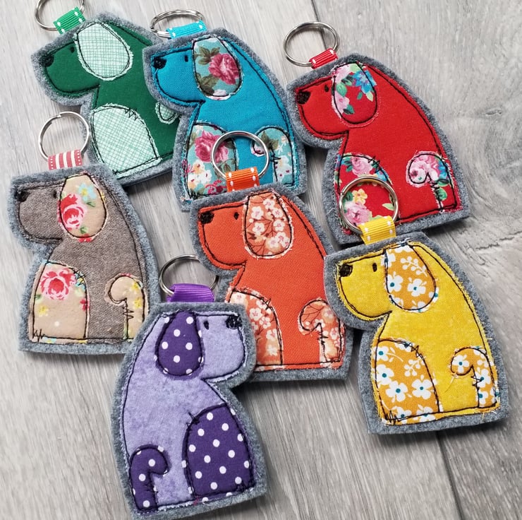A handmade dog design key ring available in rainbow colours, made from quality cottons embroidered onto a thick hardwearing felt backing which is perfectly tactile but strong. Great gift for any dog lover.