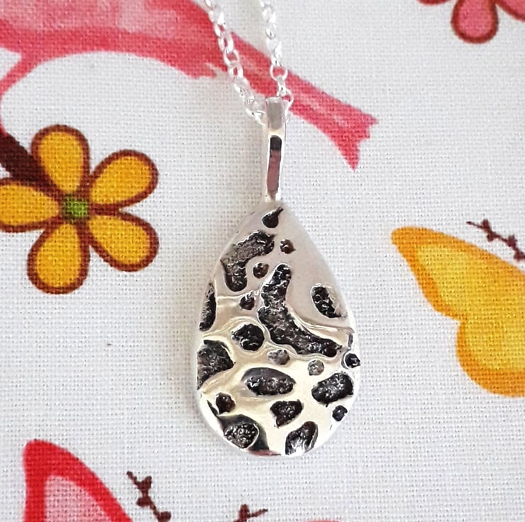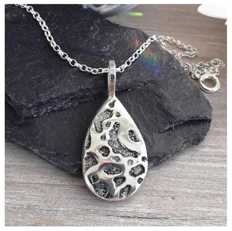 This high shine pendant has a decorative element where the dips have been given a darkening patina to highlight them adding beautiful interest.