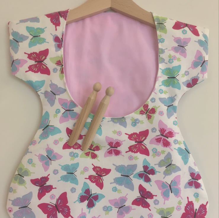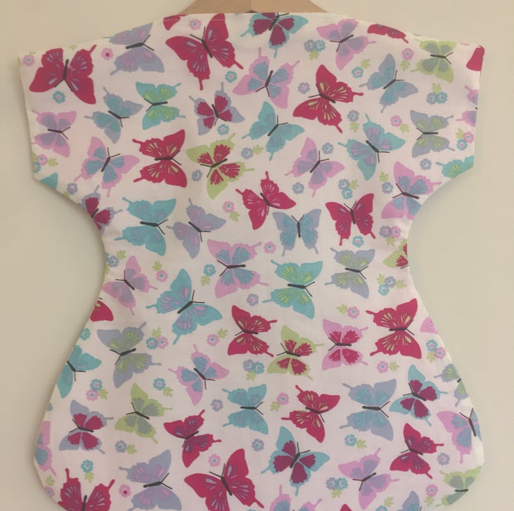A dress shaped peg bag made from 100% cotton outer and lining. The main body features beautiful, pastel butterflies on a white background and is lined in a pretty pink which compliments the butterflies perfectly.
