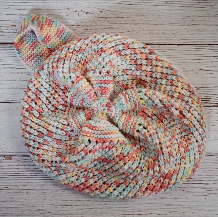 Knitted using aran weight 100% cotton yarn in love heart pastel colours.