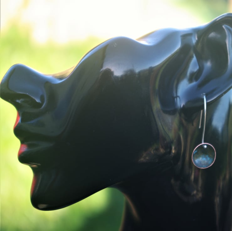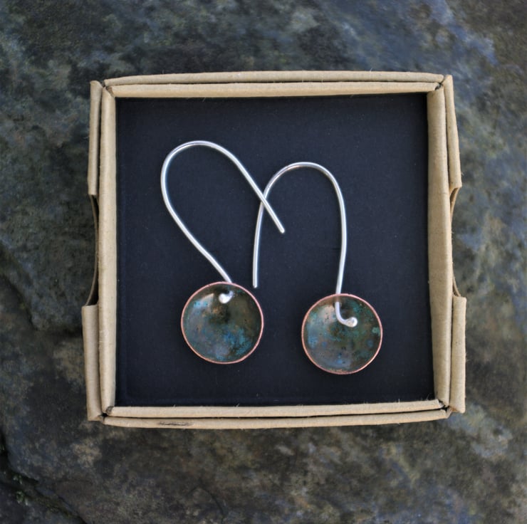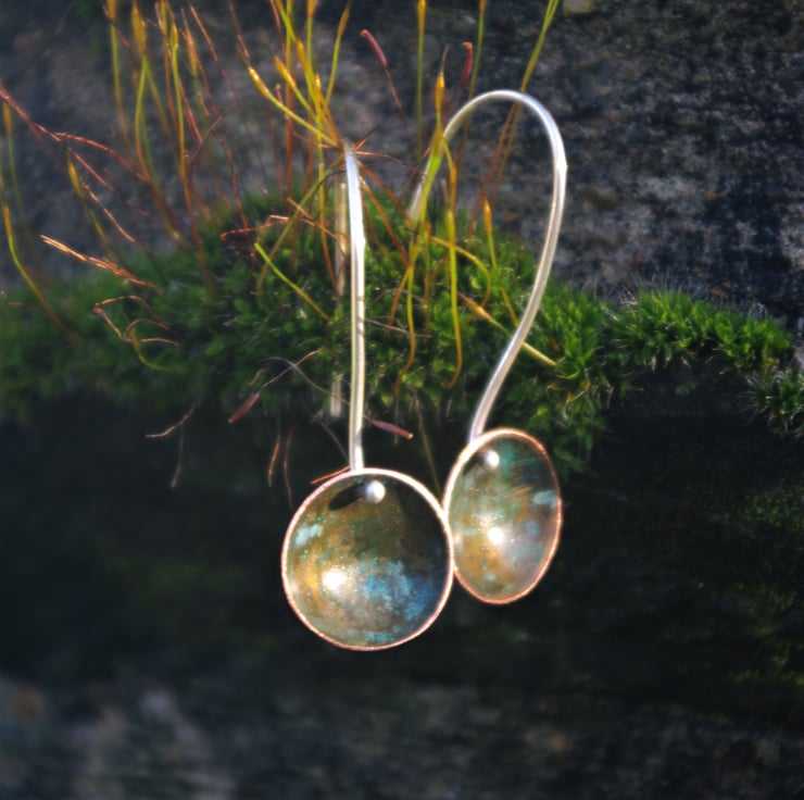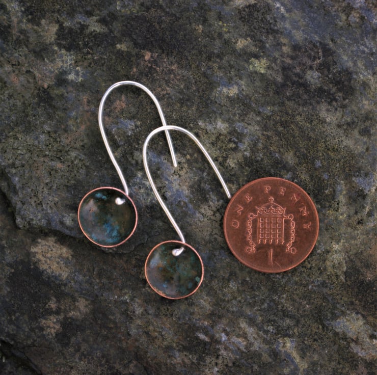 I have used patination techniques to produce lovely mossy green colours with spots of deep turquoise onto a 12mm /0.5 inch diameter domed copper disc. The edges have been brought back to their original shiny copper. The turquoise colours pop out more in the light.