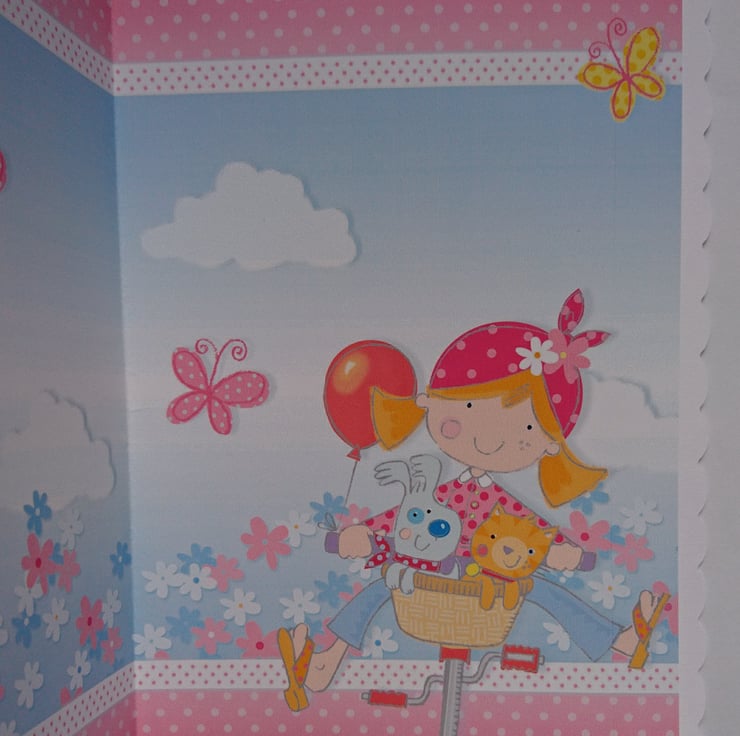 The design is a lovely little girl enjoying riding her bike. She has taken her cat and dog in her basket along for the ride and they seem to be enjoying it too! A balloon, flowers and butterflies are fluttering around them as they whizz along.