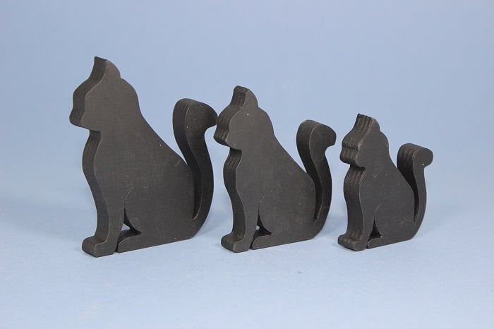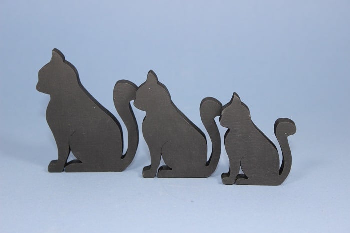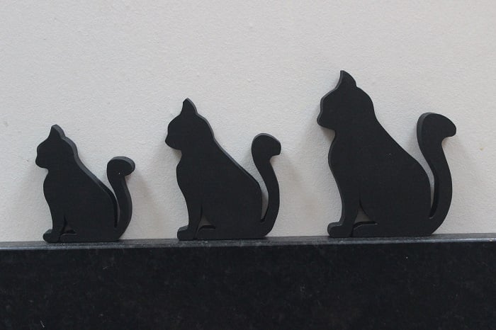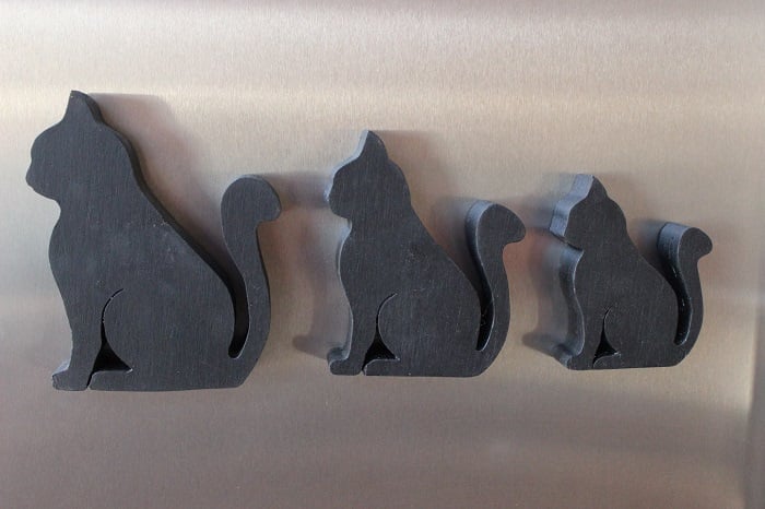 A set of three - small, medium and large - matt black cat fridge magnets. Each cat is fitted with a super strong neodymium magnet, which means it whont slide down the fridge door!