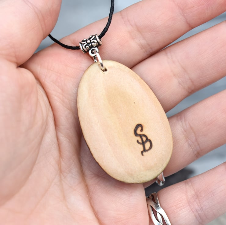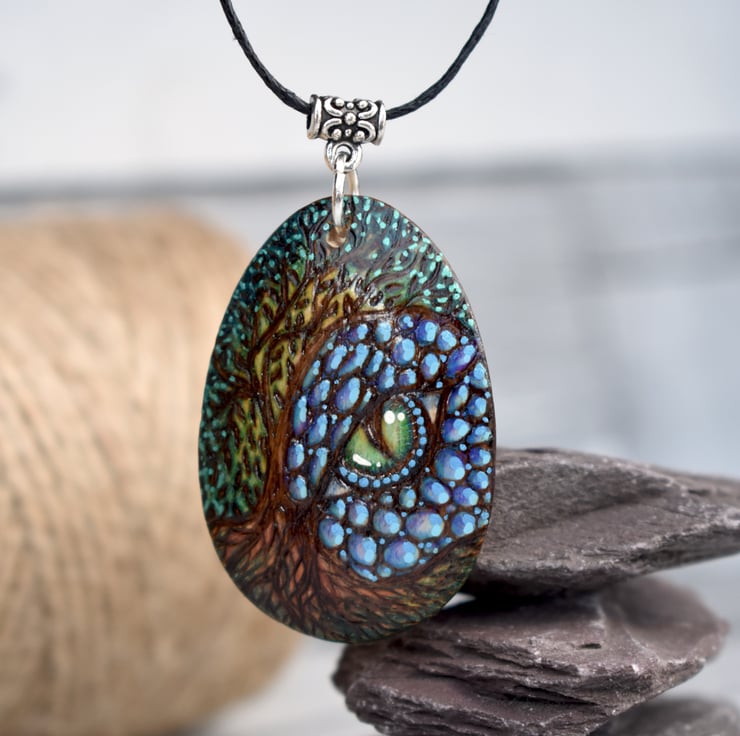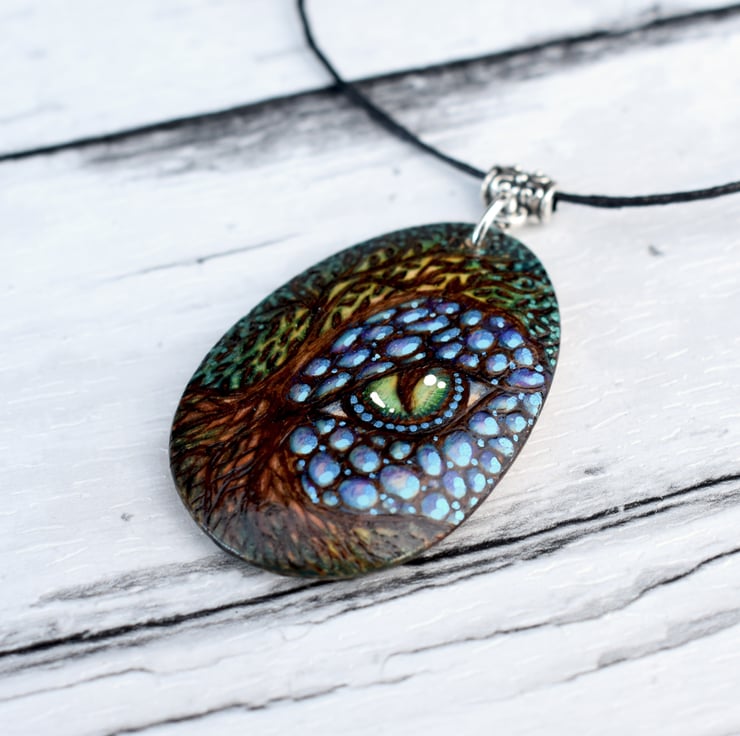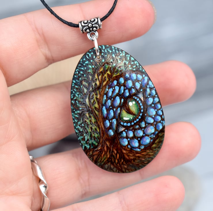 A dragon themed pendant, with the dragon camouflaged in the landscape. Hand burned using pyrography and coloured with art pencil.