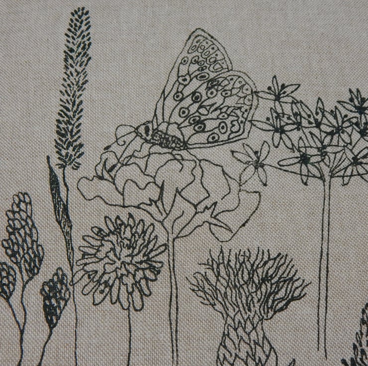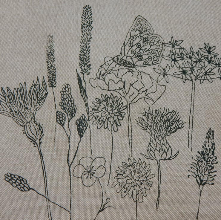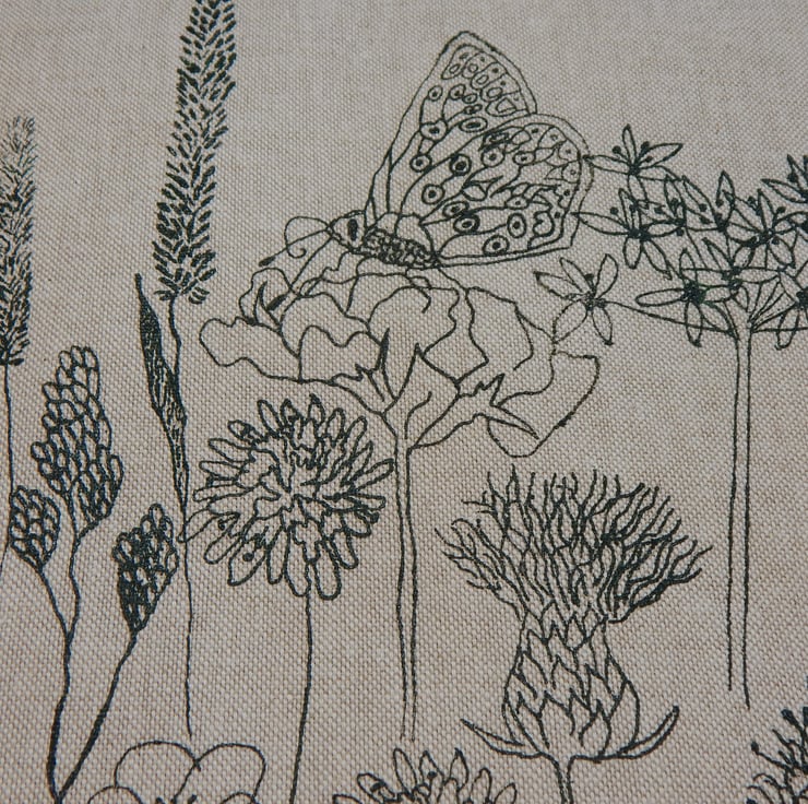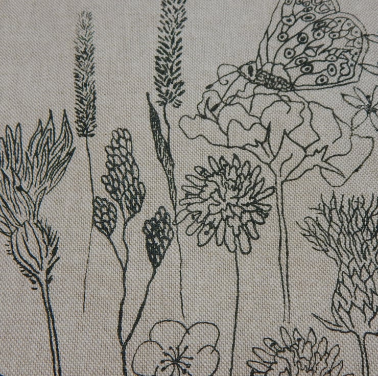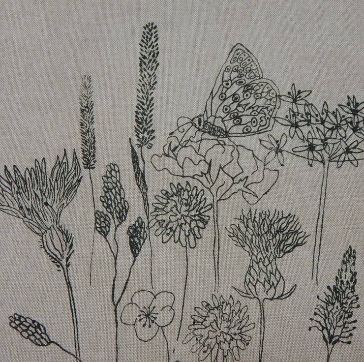 There is a common blue butterfly on a birds foot trefoil. There is wild garlic, hoary plantain, knapweed, buttercup, scabious, wild grasses and hawkbit. Each flower has been printed individually allowed to dry and then the next one is printed. The fabric piece has about 1 inch clear around the design. The piece can be delicate machine washed on a cool less than 30 0 C cycle. Do not tumble dry and cover with a fabric piece when ironing.