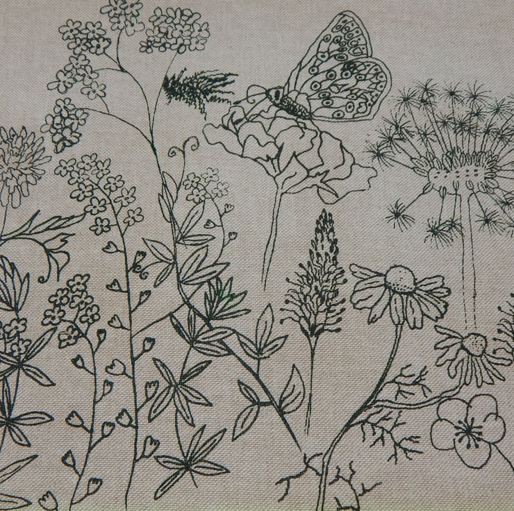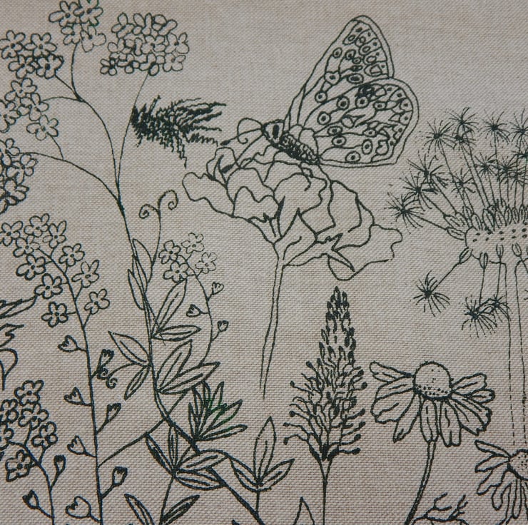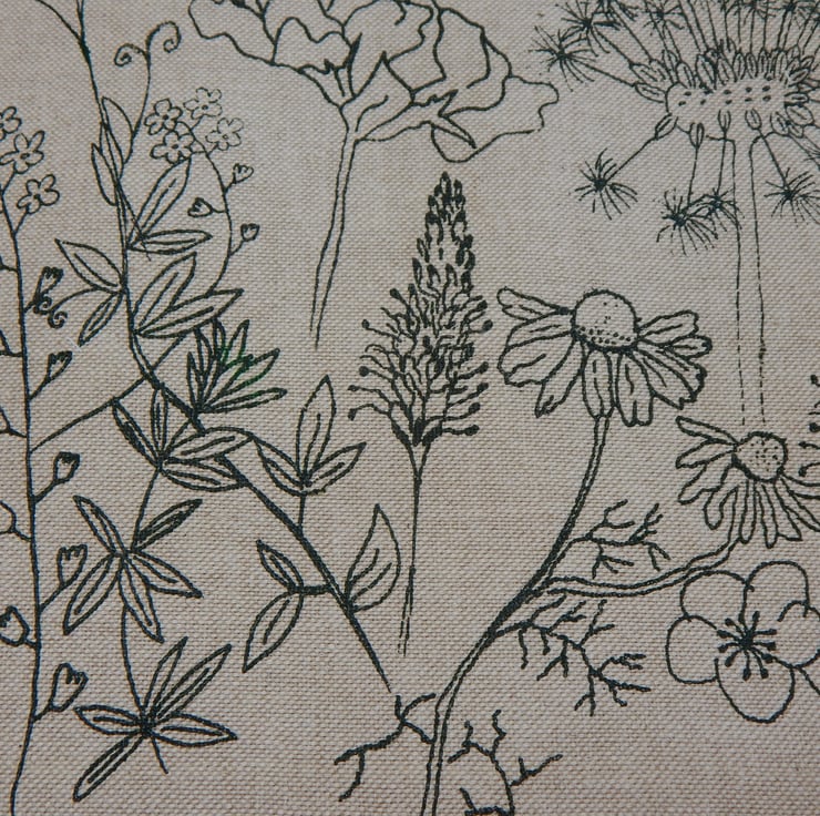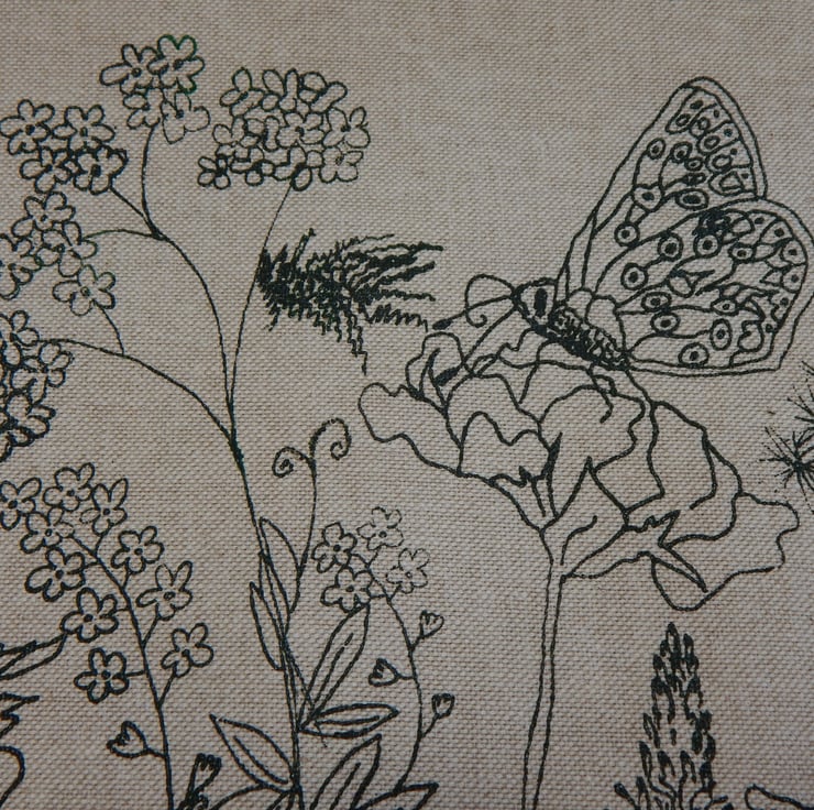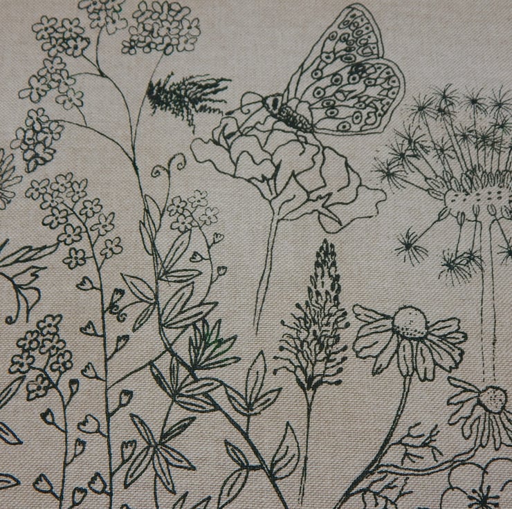 There is a common blue butterfly on a birds foot trefoil. There is a dandelion clock, hoary plantain, knapweed, buttercup, scabious, forget me not, chamomile and achillea. Each flower has been printed individually allowed to dry and then the next one is printed. The fabric piece has about 1 inch clear around the design. The piece can be delicate machine washed on a cool less than 30 0 C cycle. Do not tumble dry and cover with a fabric piece when ironing.