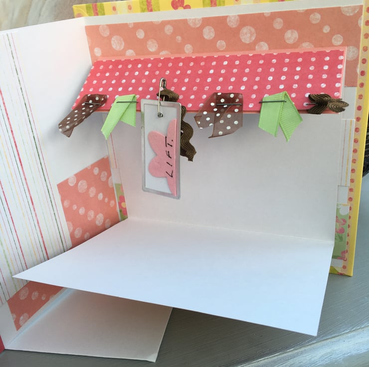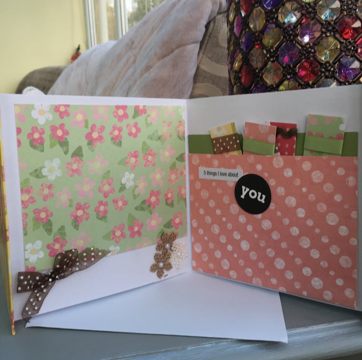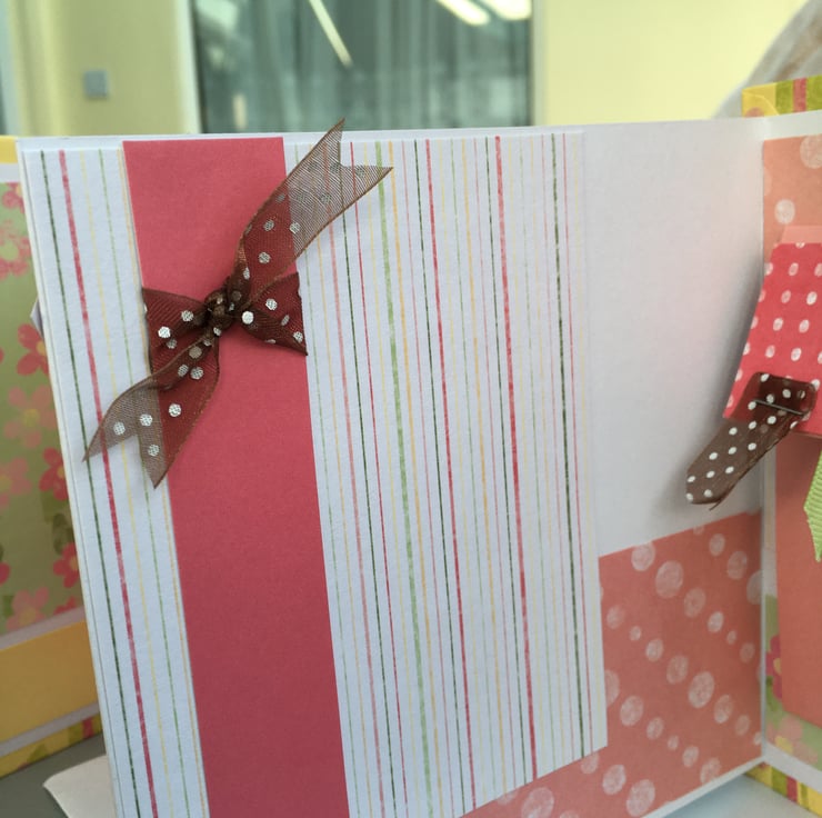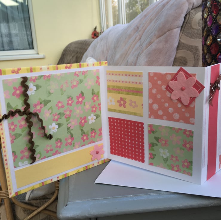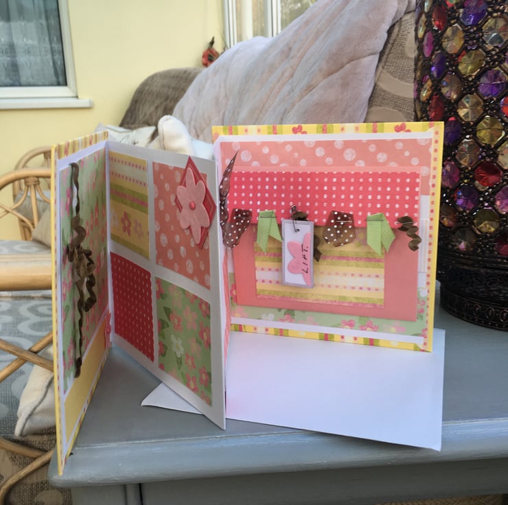A mini scrapbook that can be used as a card, for a very special occation, a brag book, journal, a baby book - the list is endless.This hardback concertina book has 6 decorated sides done in pinks yellows and greens. Each page has spaces for photos and journaling, recording special moments in someones life. It could be a brag book for a grandparent or parent, a card sent on a big birthday - adding a few baby photos and memories- to someone special, a scrapbook of a special occation, lots to choose from. The book is 16.5x16.5cm and has lots of space for pictures, thoughts and memories, pockets for special keepsakes. The ideas are endless. The colours and design are definitely on the feminine side but who you use it for is your choice - birthday, new baby, anniversary, engagement or wedding. All pages, including the covers are decorated in coordiating pretty papers with dots,stripes and florals.