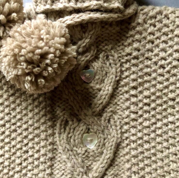 Heart shaped hot water bottle and cashmere handknitted cover with heart shaped shell buttons and pom pom trim. Wrapped in a linen fabric bag.