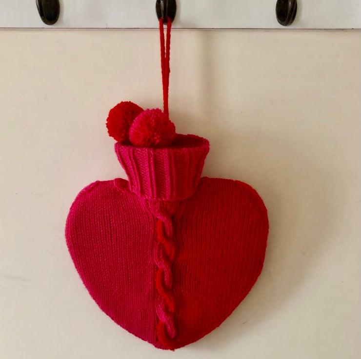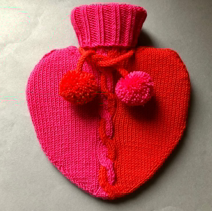 I wanted to make a hot water bottle that looked warm so I combined red and hot pink yarns and intertwined them in the central cable panel. It is wrapped in a drawstring fabric bag with a heart motif detail.
