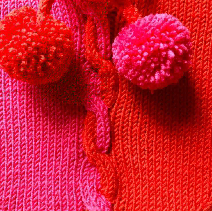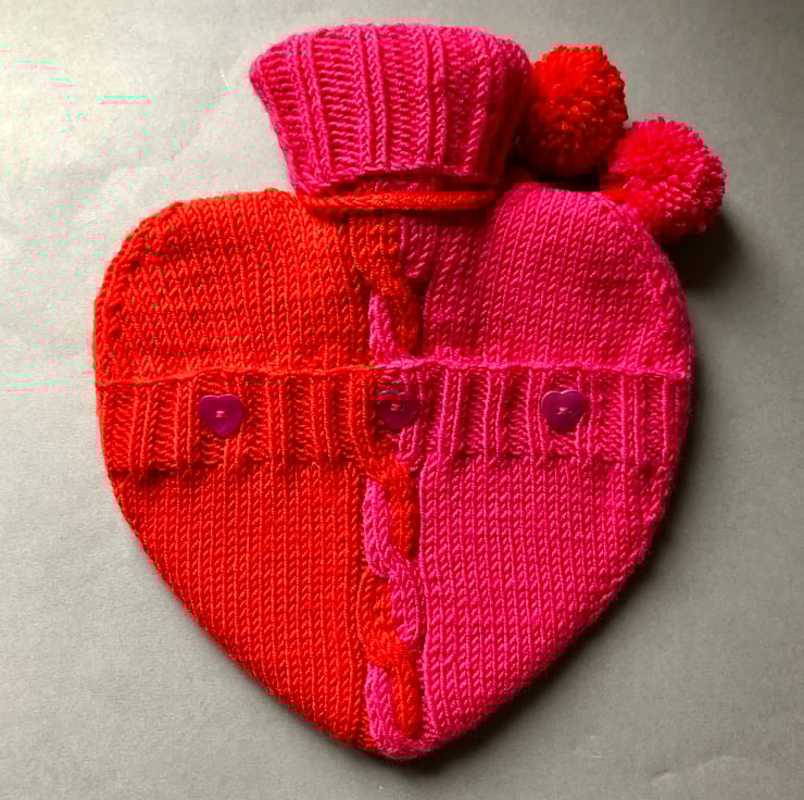 Heart shaped hot water bottle and red and pink handknitted cover with pom pom trim and heart shaped shell buttons. Wrapped in a fabric drawstring bag.