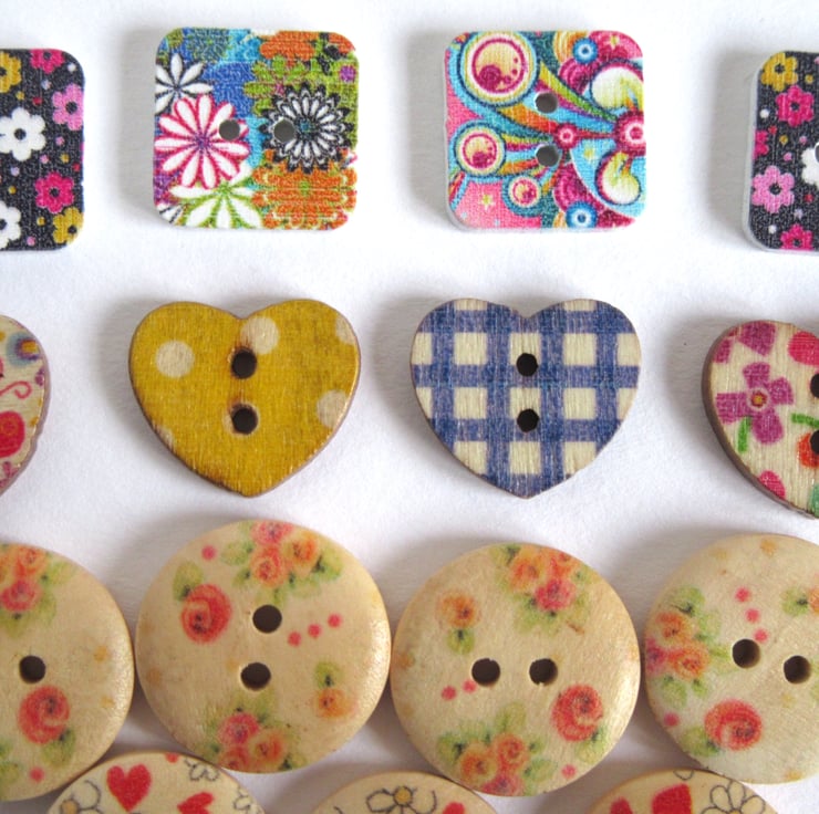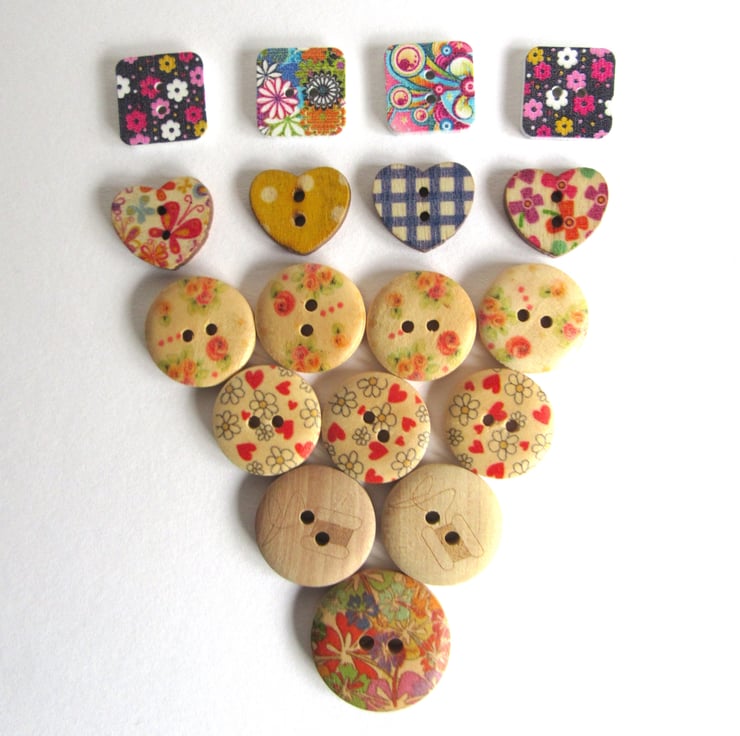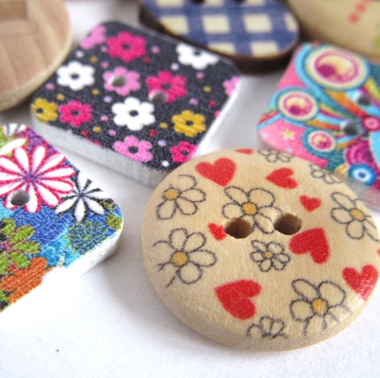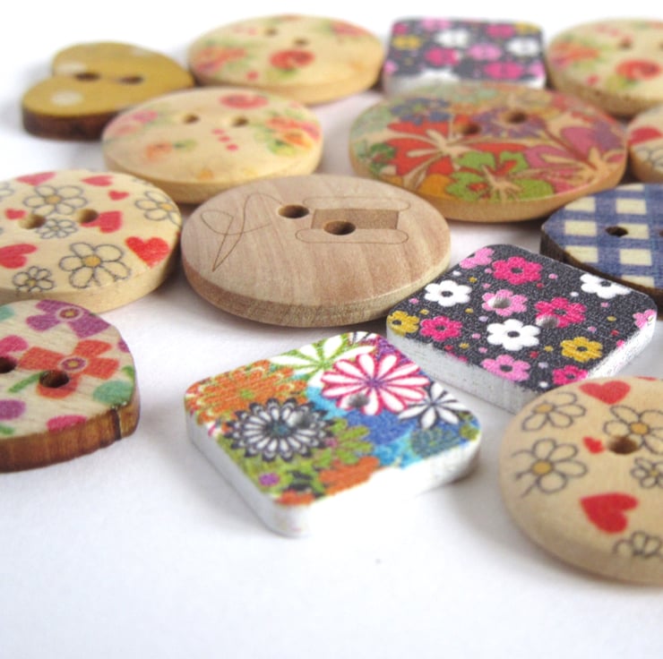 A mixed collection of wooden buttons with mostly floral patterns on them in multiple colours.