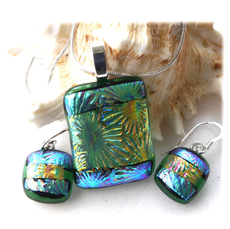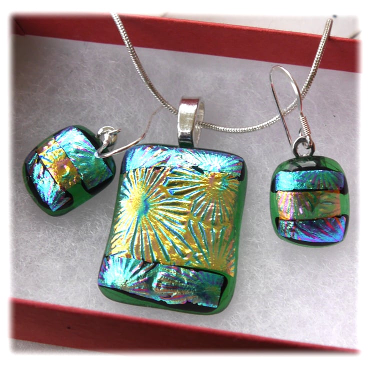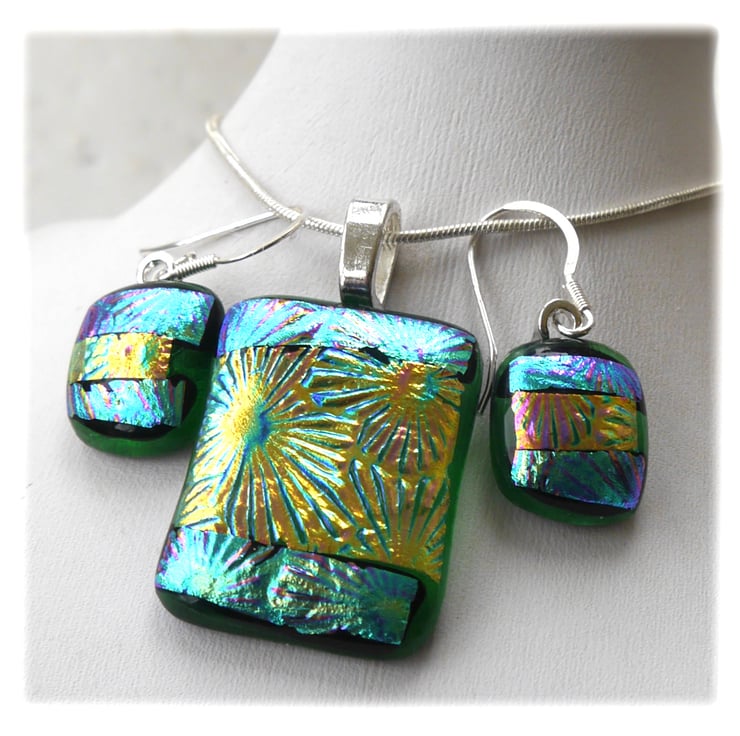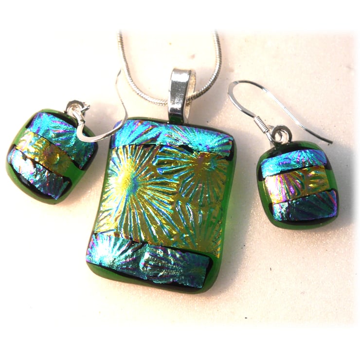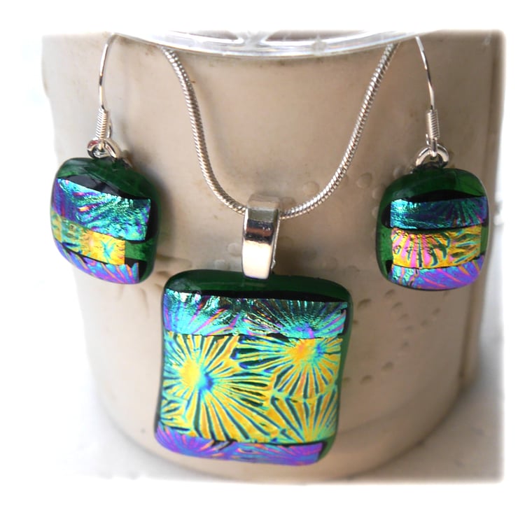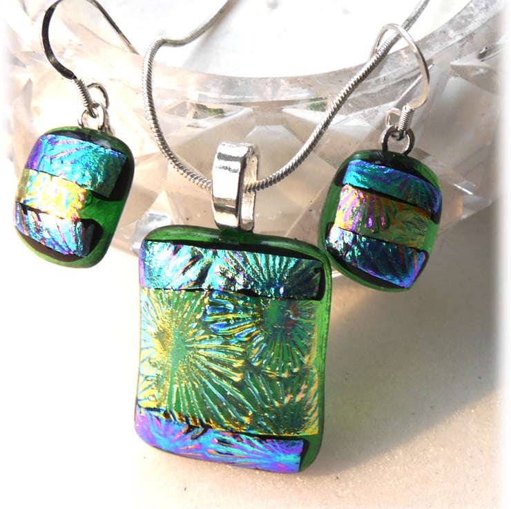 The dichroic glass cabochons for the pendant, matching earrings were handmade, by me with love.