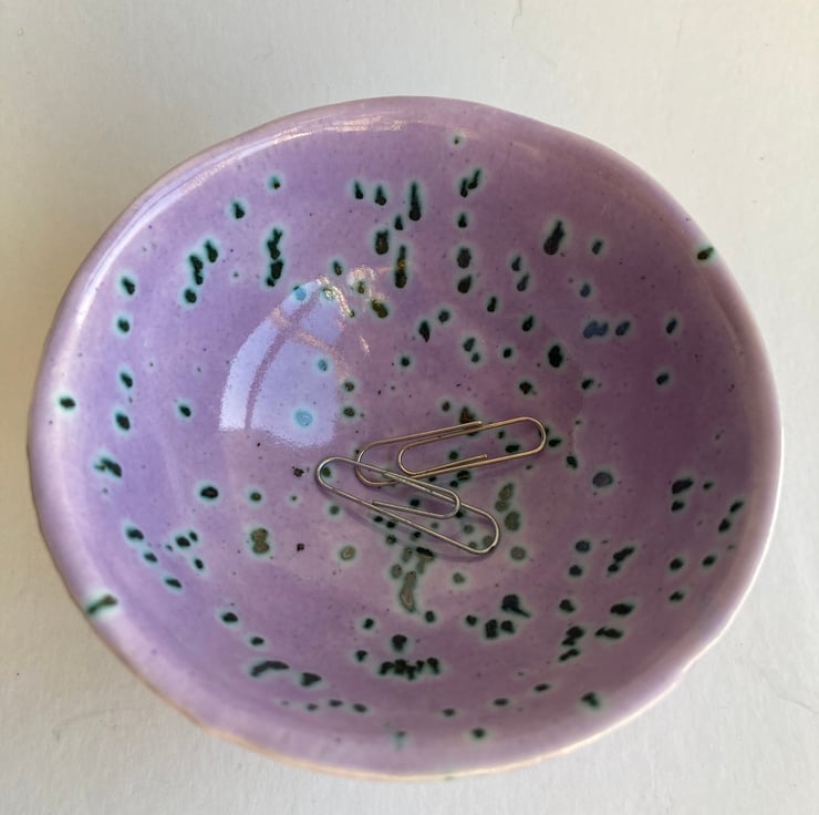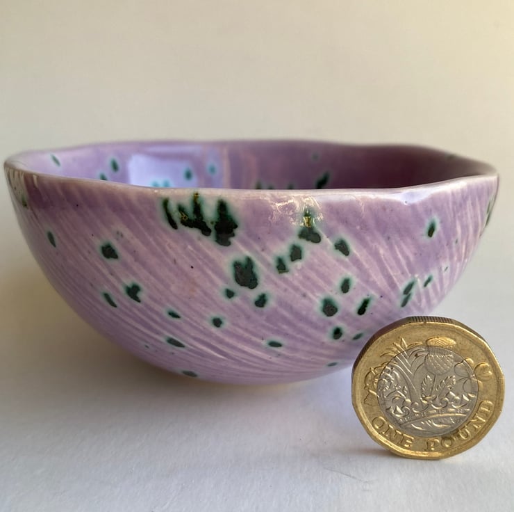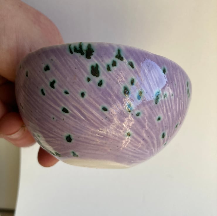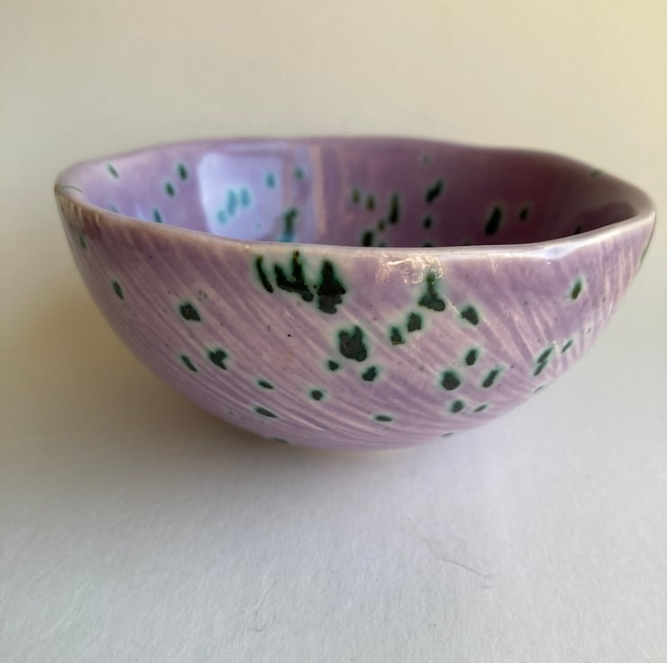 Handmade ceramic bowl decorated with tooled swirl lines giving it a tactile texture. Finished in earthenware lilac & random green speckled glaze, making each one unique.