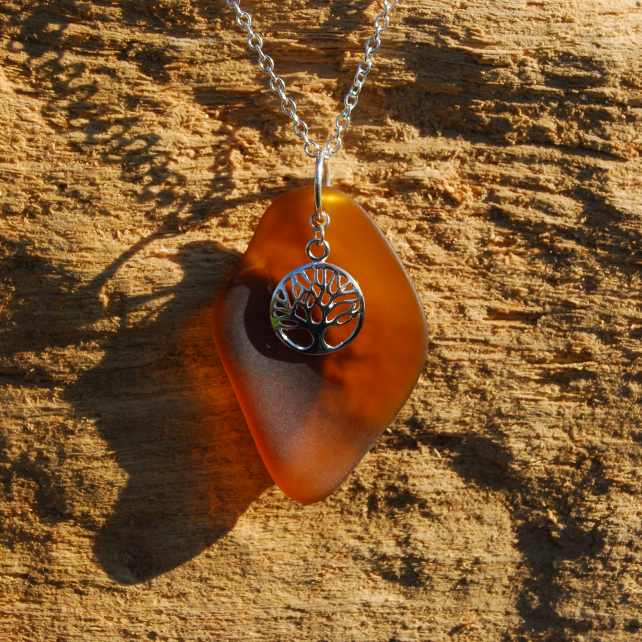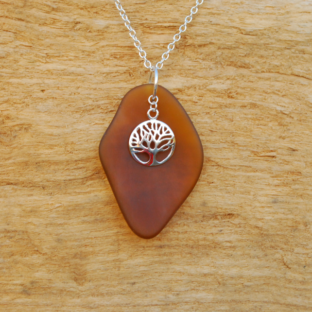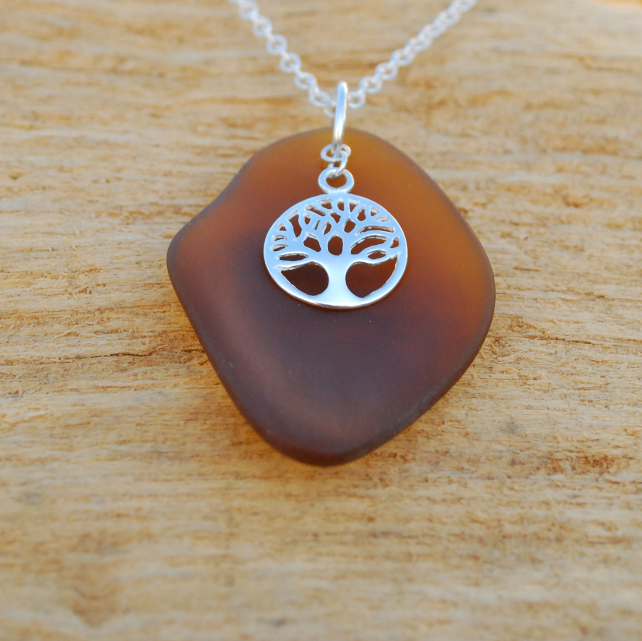 The glass we've used for this lovely pendant has come from an old bottle and curves beautifully behind the tree. It's a rare shade of brown, being lighter and more transparent than most other brown glass. We've tumbled the glass so it is rounded and finely frosted. The pretty charm is sterling silver, as is the rest of the metal used to make this attractive pendant.