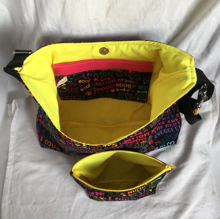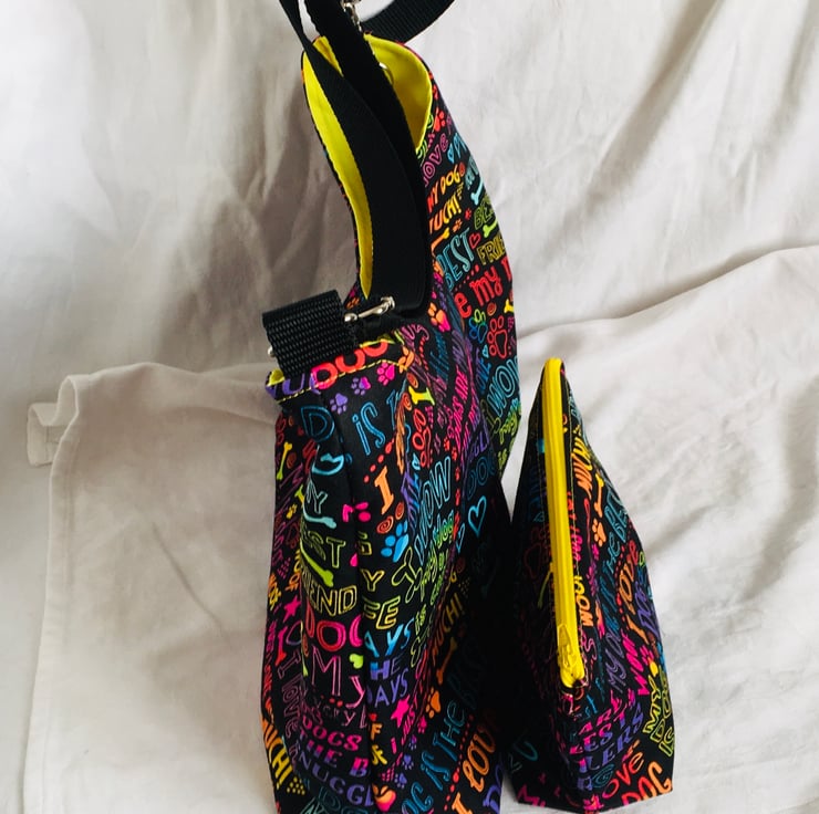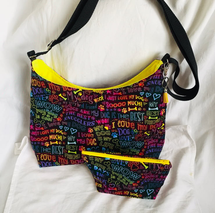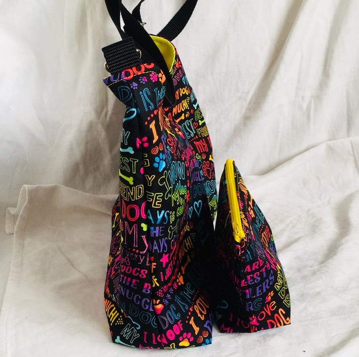This set would make a fantastic gift for any Dog lover, a present for a teenager or an additional bag just for you. The bag has been made from high quality cotton fabric with bright colourful words relating to Dogs on a black background, which has been interfaced to help with structure and stability. The lining is a plain cotton fabric and handle a strong webbing, fully adjustable.