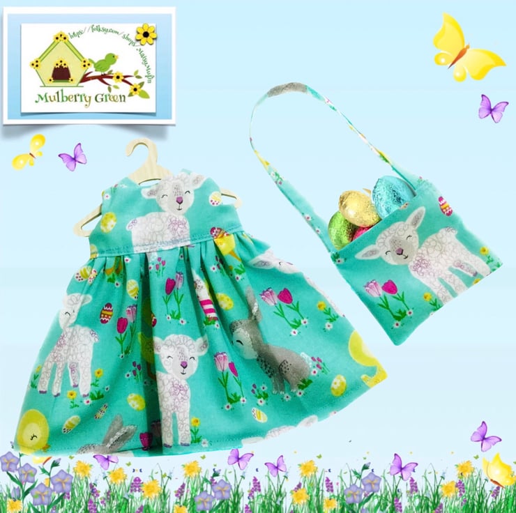 A cute little Easter dress in a lambs, bunnies and chicks print. The dress has a sweet little matching bag that can be filled with little chocolate Easter eggs. Eggs not supplied.