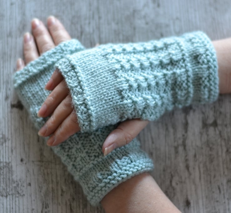Ladies aran knit fingerless gloves in a lovely duck egg blue.