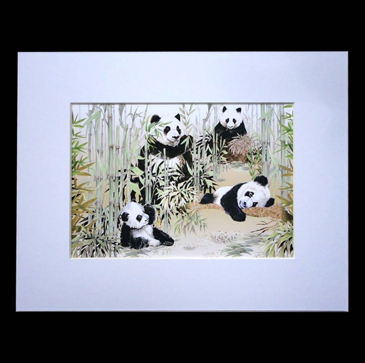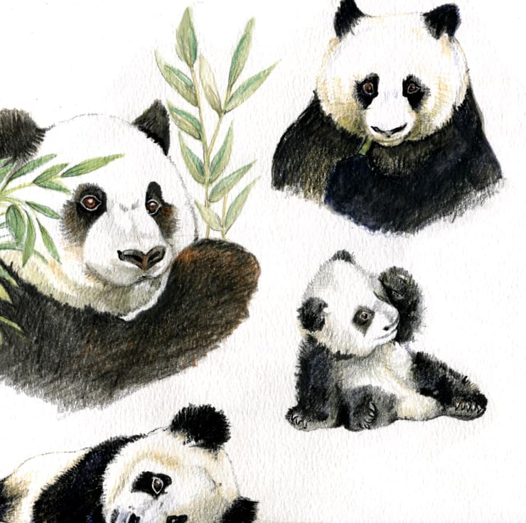 Wonderful Pandas! we all love pandas don’t we. This imaginery scene I have created in Photoshop. My beautiful family of Pandas are hand-drawn in water-colour pencil to get a softness of texture. The bamboos plants are hand-drawn, inter-mixed with photographic elements. An ombre background created in Illustrator brings this fantasy scene to life. Whilst the parents feed, the young ones laze around, the older one stretched out on a cork branch and the cutest little one is sat on the ground looking extremely tired. Shame that such beautiful animals are now on the endangered list with loss of habitat!
