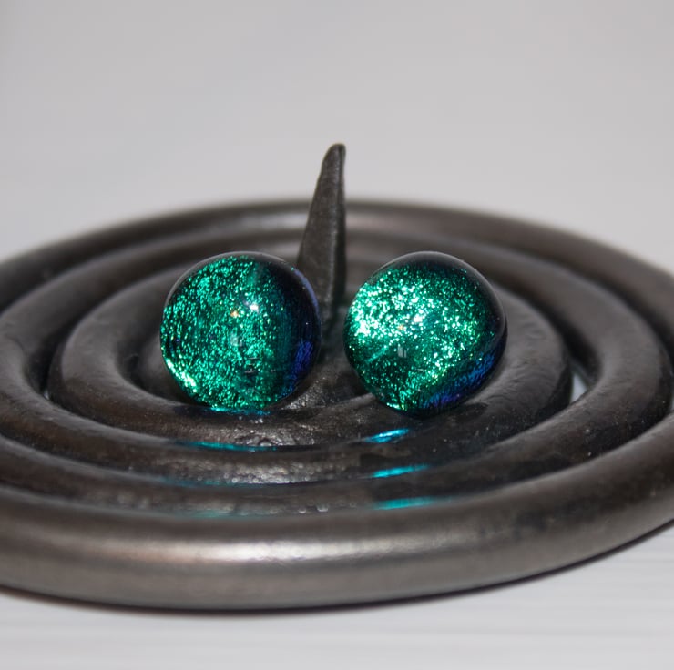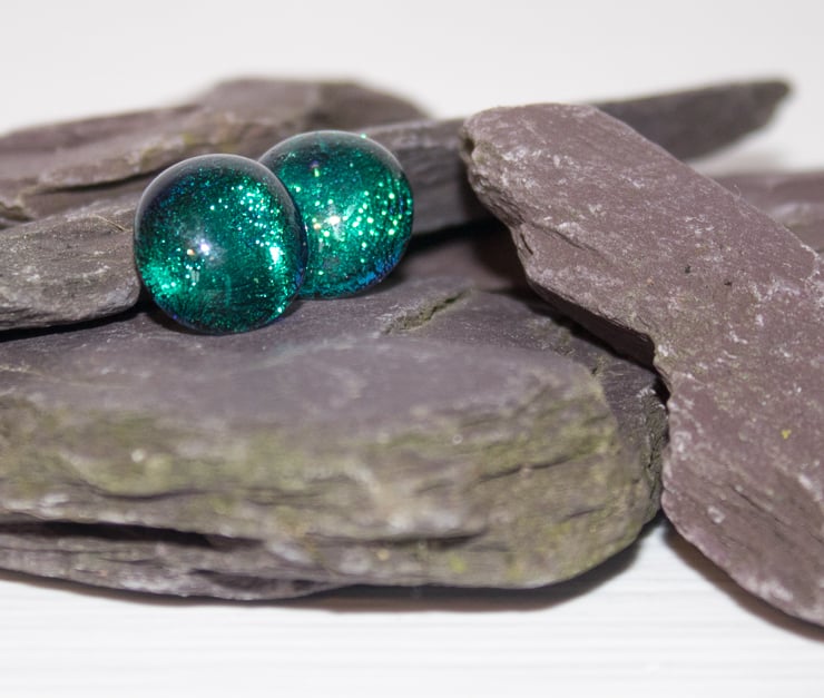 This pair is Emerald Green with a sparkle, but if the light catches them right they can show other colours. The studs and butterfly backs are Sterling Silver. They will be shipped in a black presentation box.