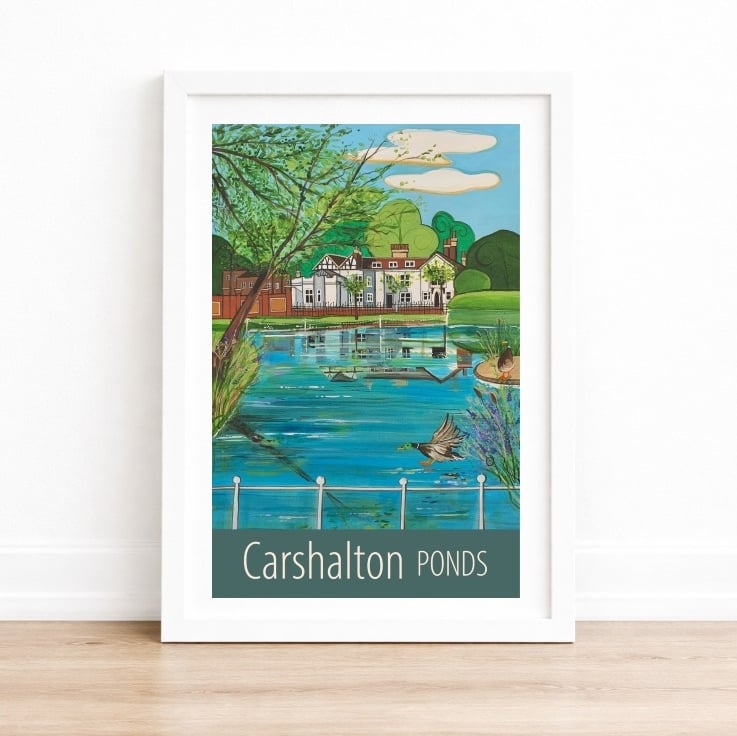 A contemporary travel poster style print of the lovely Carshalton Ponds, in Surrey, from my own original acrylic painting. A perfect gift for those who love Carshalton!
