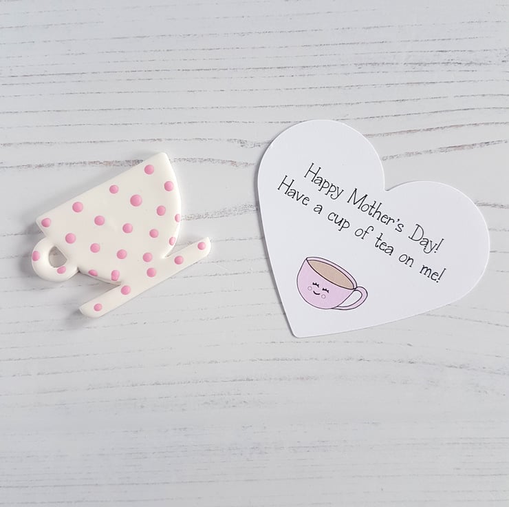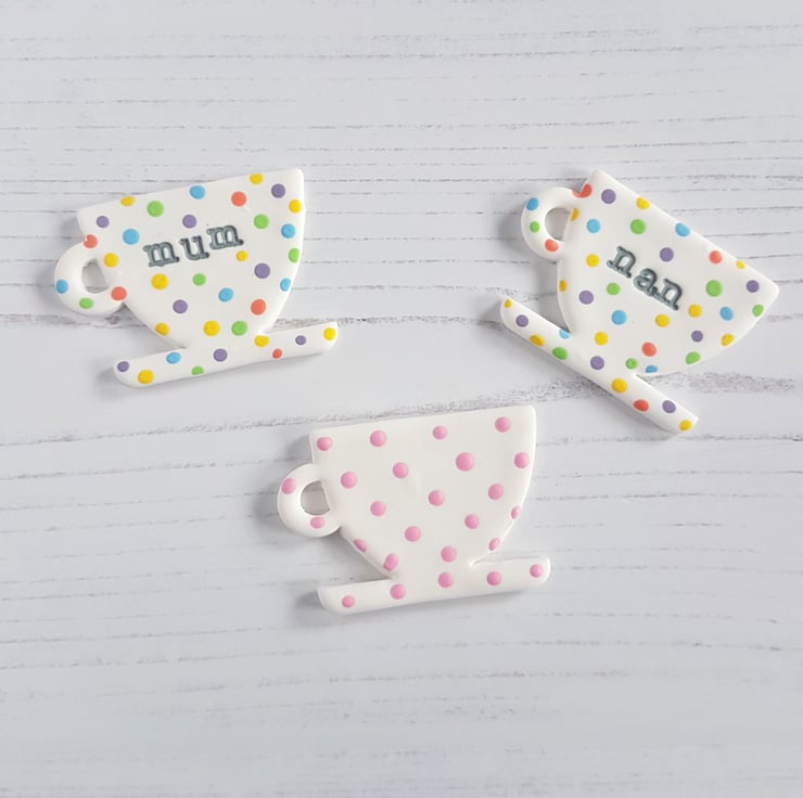 These little cup shaped tokens are made from white polymer clay, with a name of your choice hand stamped in the centre. The lettering is then hand painted using grey acrylic paint for definition. The surround is either then painted with pastel polka dot colours or pastel pink dots, ready to send. (You can also choose to have a token with no wording)