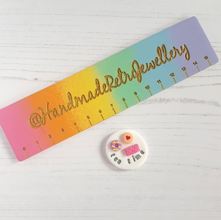 These little tokens are made from polymer clay, with the phrase TEA TIME hand stamped. The lettering is then hand painted using grey acrylic paint for definition.