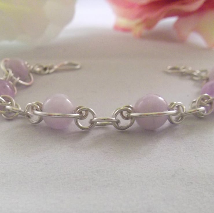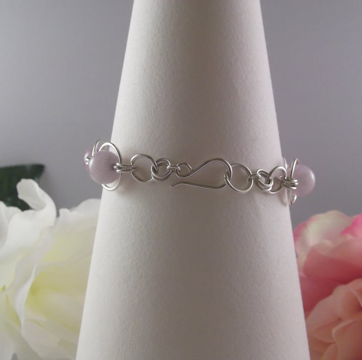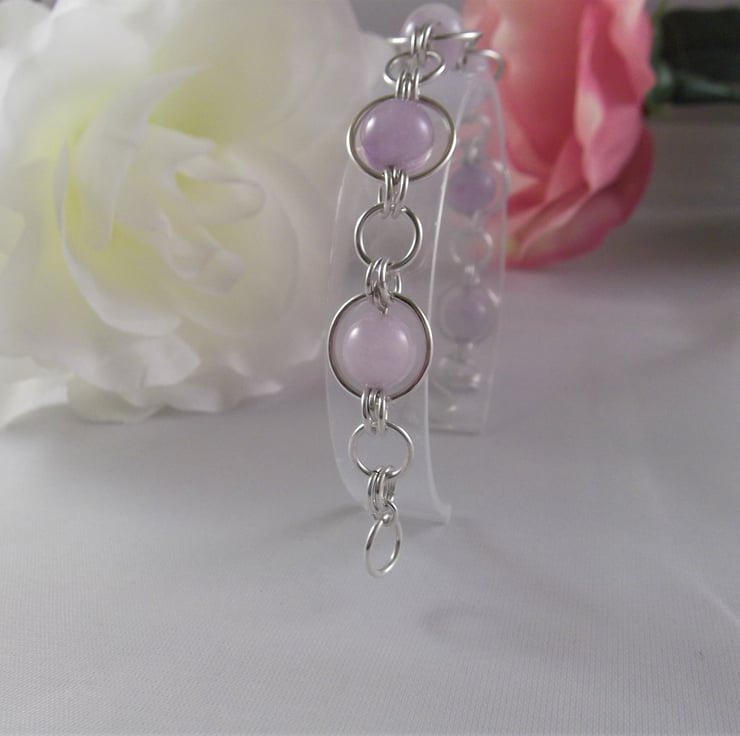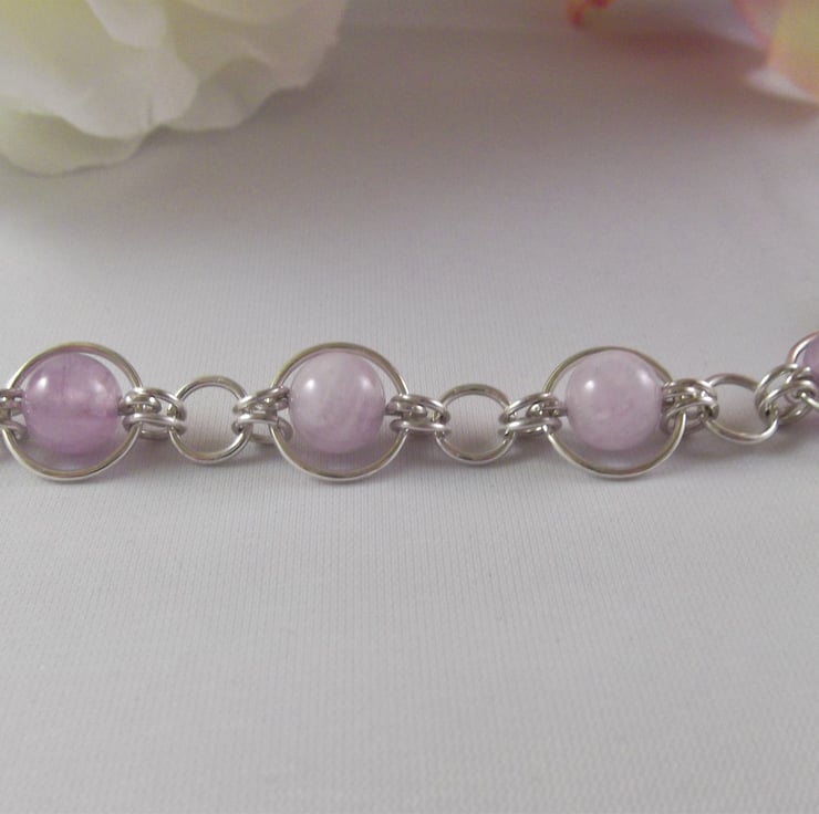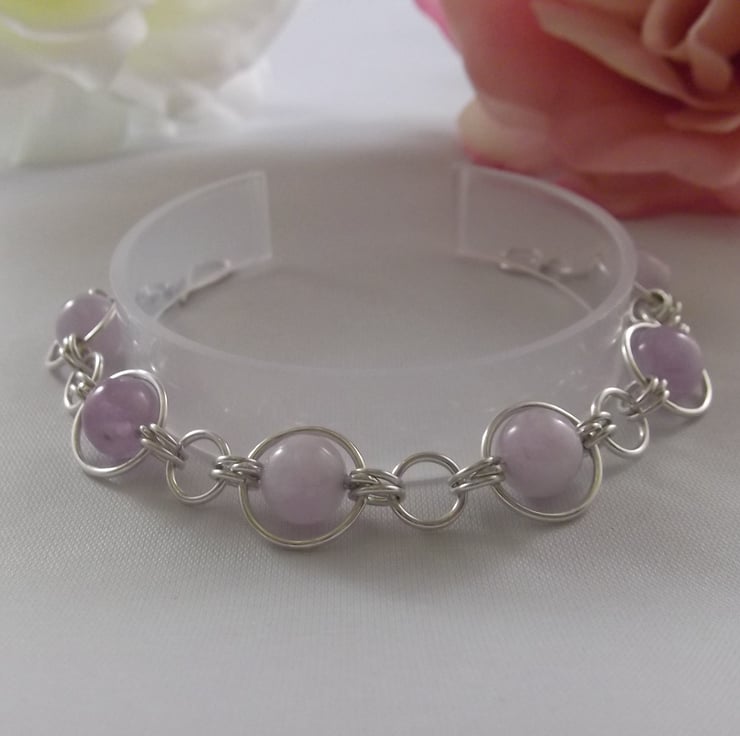 Part of the Circles collection, this bracelet consists of an 8 mm lavender amethyst gemstone bead encased in a 10 mm sterling silver circle. Smaller silver circles connect this to a 5 mm sterling silver circle. This pattern is repeated for the length of the bracelet.